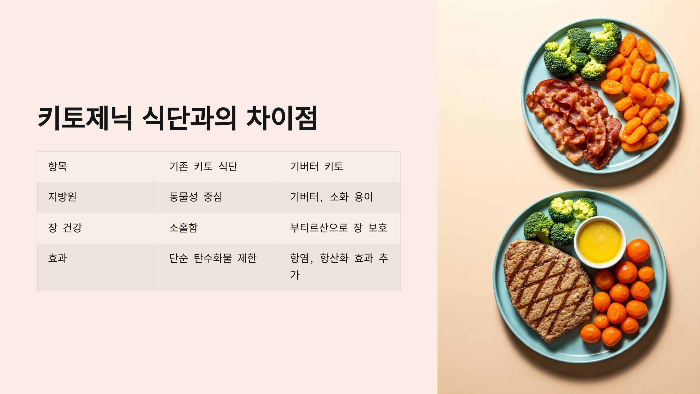 | 항목 | 기존 키토 식단 | 기버터 키토 |