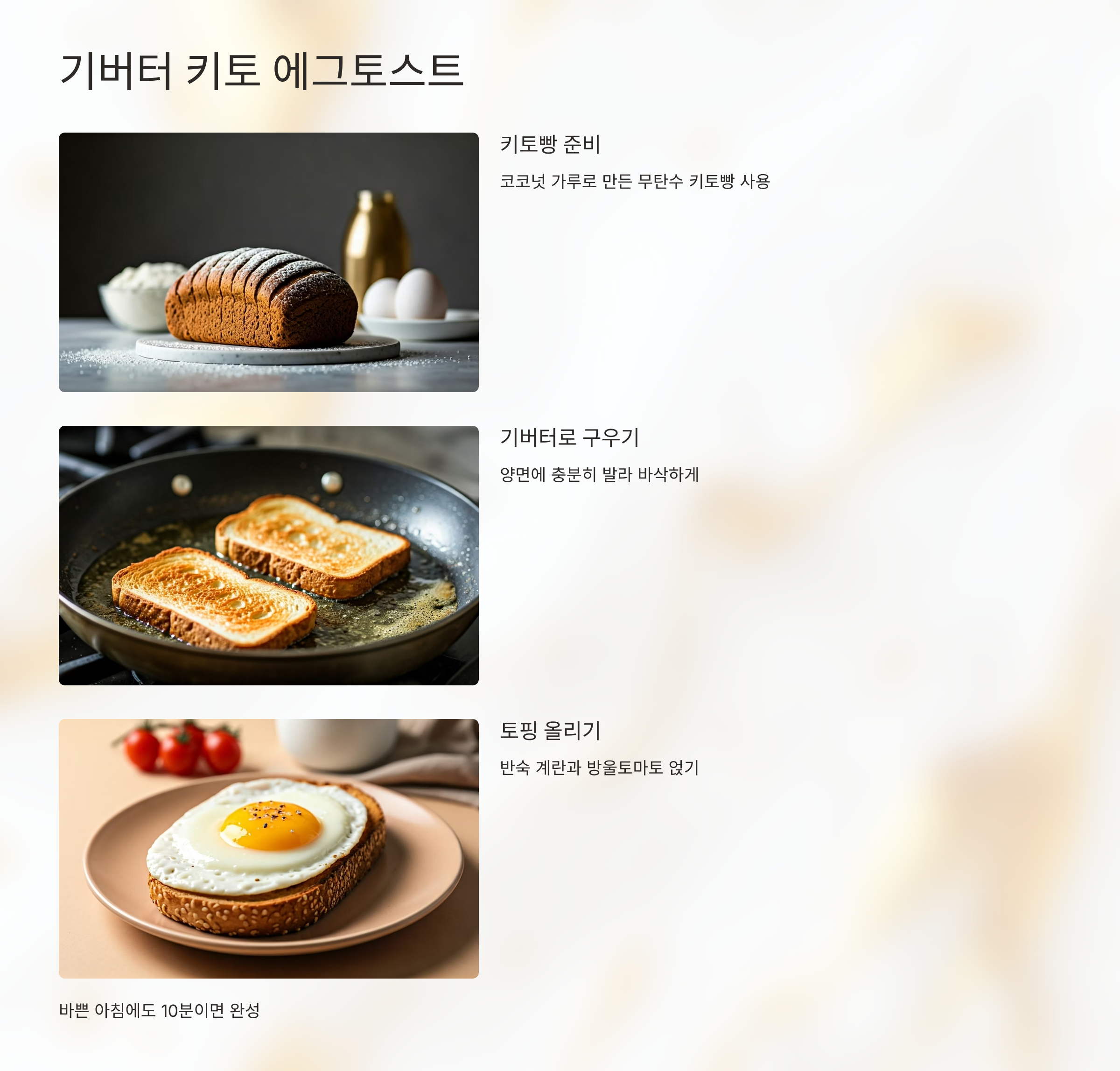 토스트도 키토식으로 즐길 수 있다는 거 아시나요? 저는 코코넛 가루로 만든 키토빵을 기버터에 구워 바삭하게 만든 뒤, 반숙 계란과 방울토마토를 얹어요. 바쁜 아침에도 10분이면 끝나는 초간단 레시피예요.