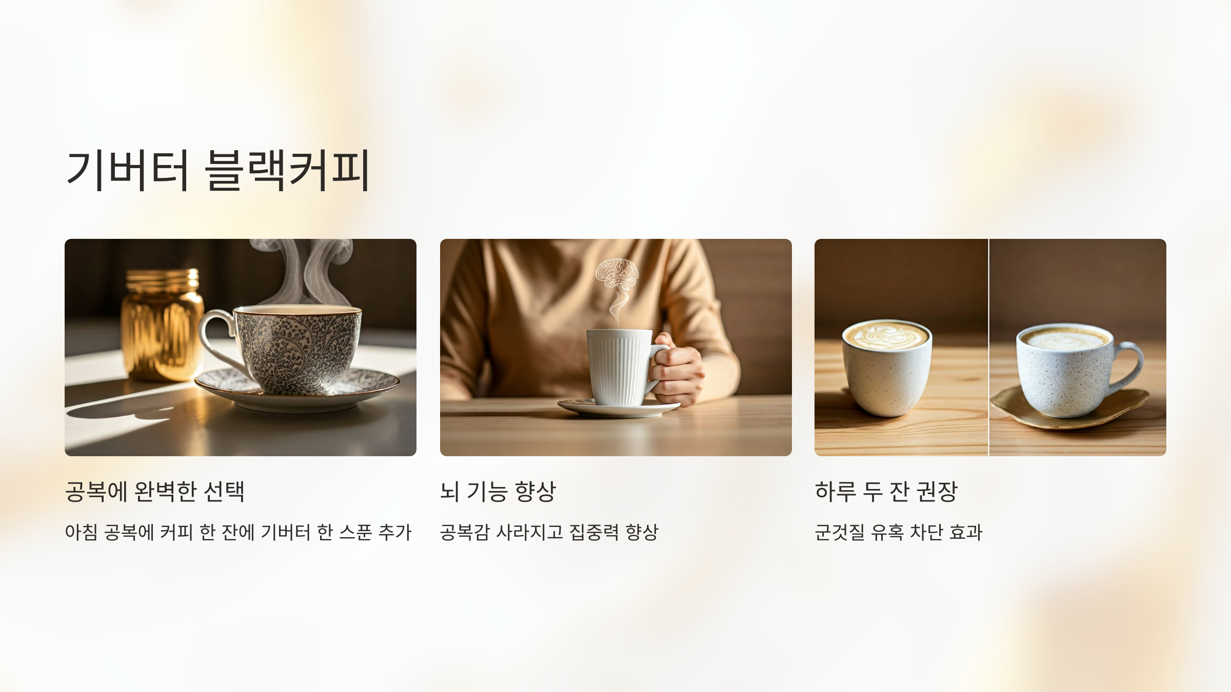 아침 공복에 커피 한 잔이 일상이신 분들 많으시죠? 여기서 기버터 한 스푼을 추가해보세요. 신기하게도 공복감이 싹 사라지고, 뇌가 맑아지면서 집중력이 확 올라가요. 저는 이 커피를 ‘기름커피’라고 부르는데요, 하루에 두 잔 정도 마시면서 군것질 유혹을 거의 끊었습니다.