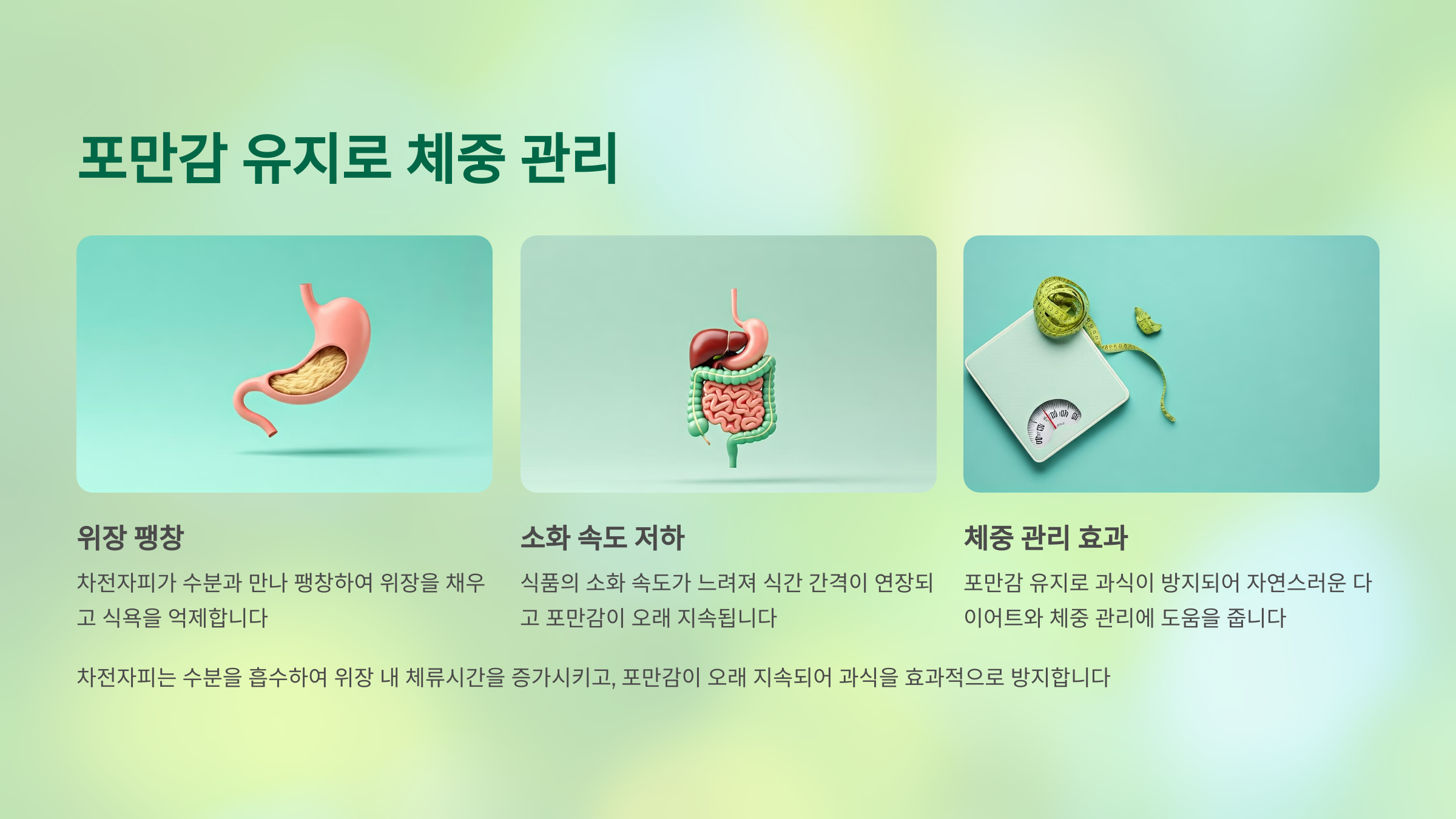 차전자피는 소화 과정에서 수분을 흡수하고 팽창하여 위장 내 체류시간을 늘립니다. 이로 인해 포만감이 오래 지속되어 과식을 방지할 수 있습니다. 다음은 차전자피가 체중 관리에 어떻게 기여하는지를 정리한 표입니다.