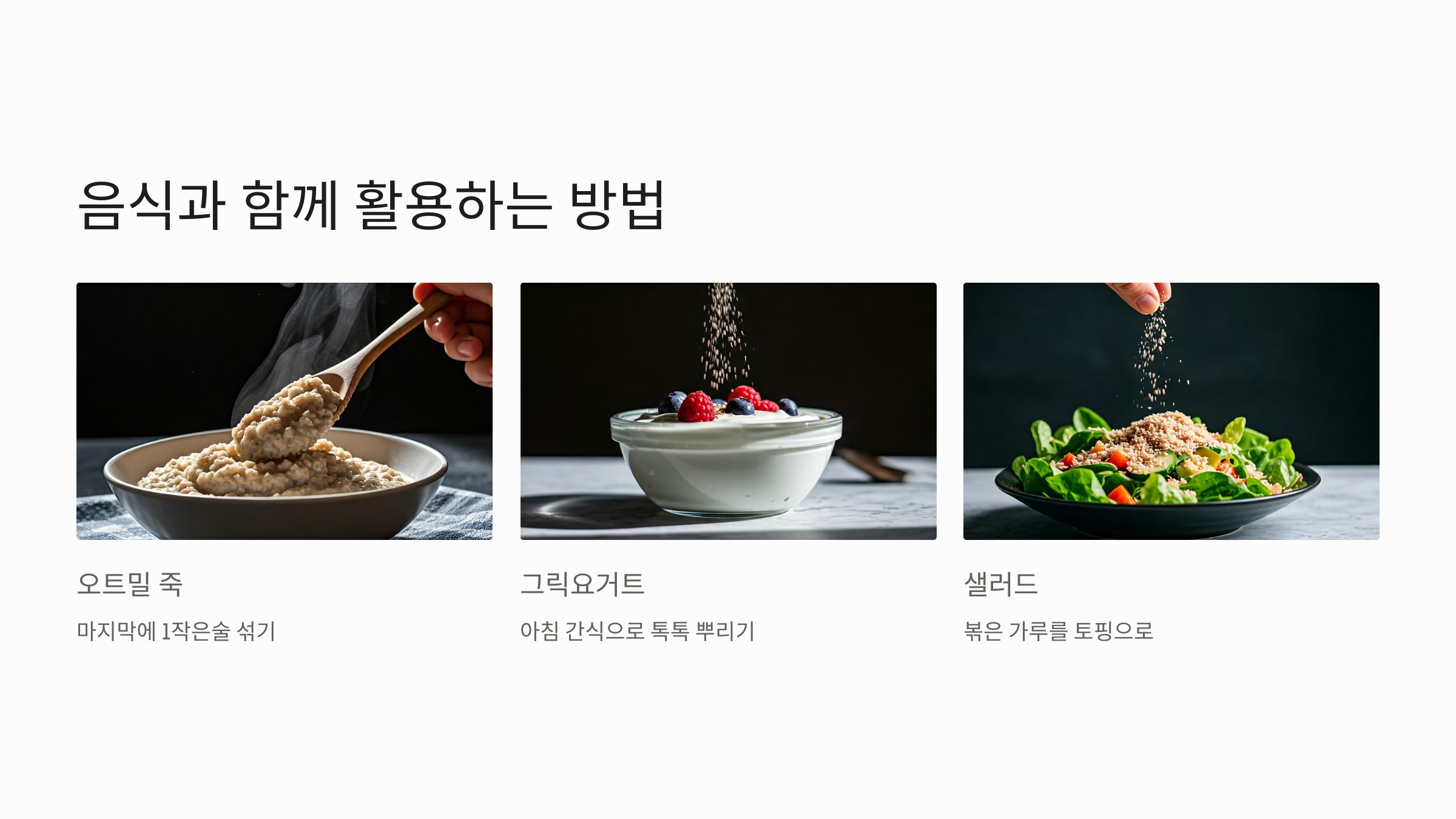 | 샐러드 | 볶은 차전자피 가루를 토핑으로 활용 |