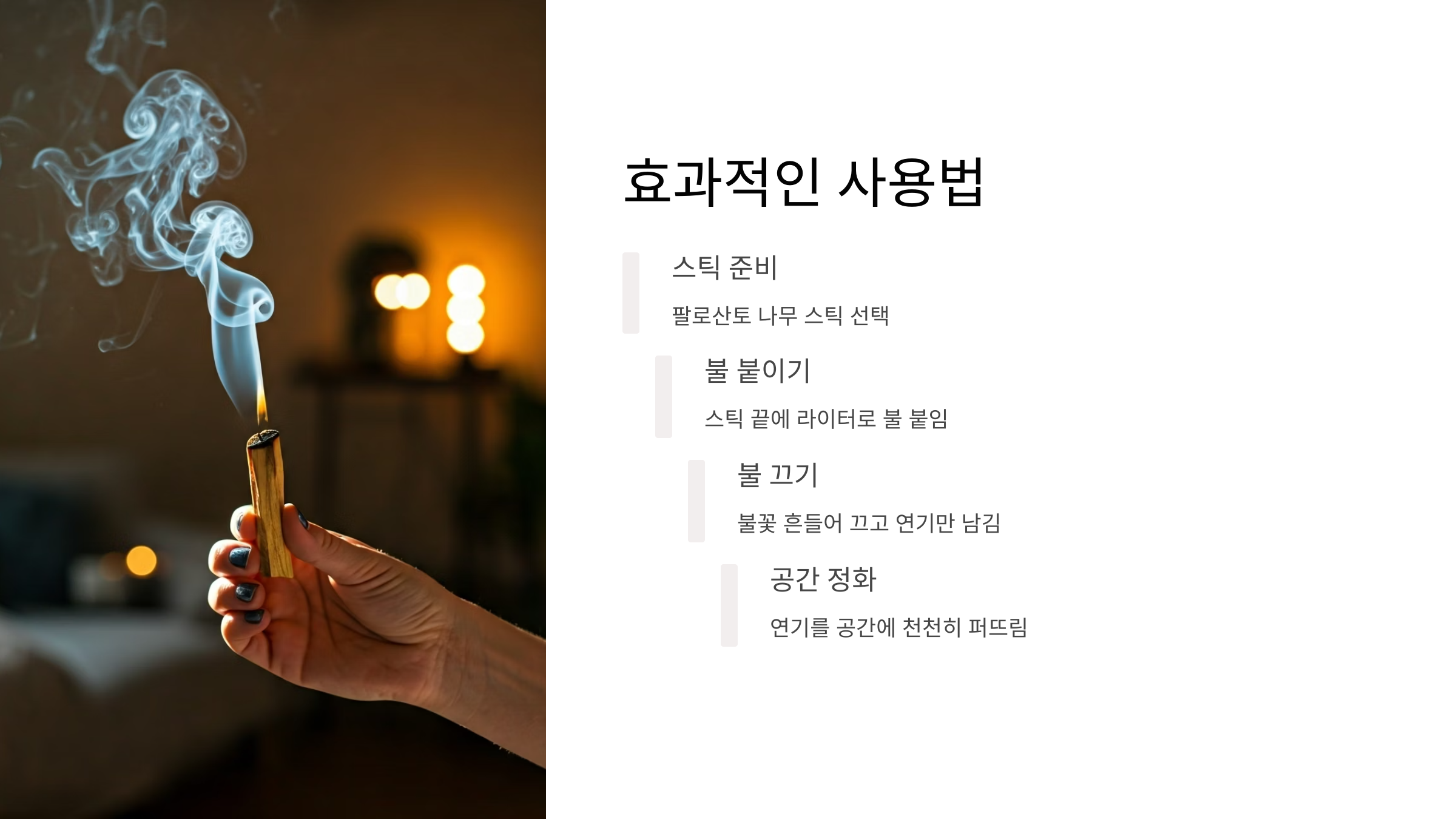 팔로산토는 간단하게 사용할 수 있어요. 나무 스틱 형태로 판매되는 것을 라이터로 끝을 태워 연기가 나오게 한 후, 공간을 천천히 돌며 연기를 퍼뜨리면 됩니다. 불은 직접 끄거나 스스로 꺼지게 두면 되고, 연기가 계속 나지 않아도 그 잔향만으로도 충분한 효과를 줍니다.