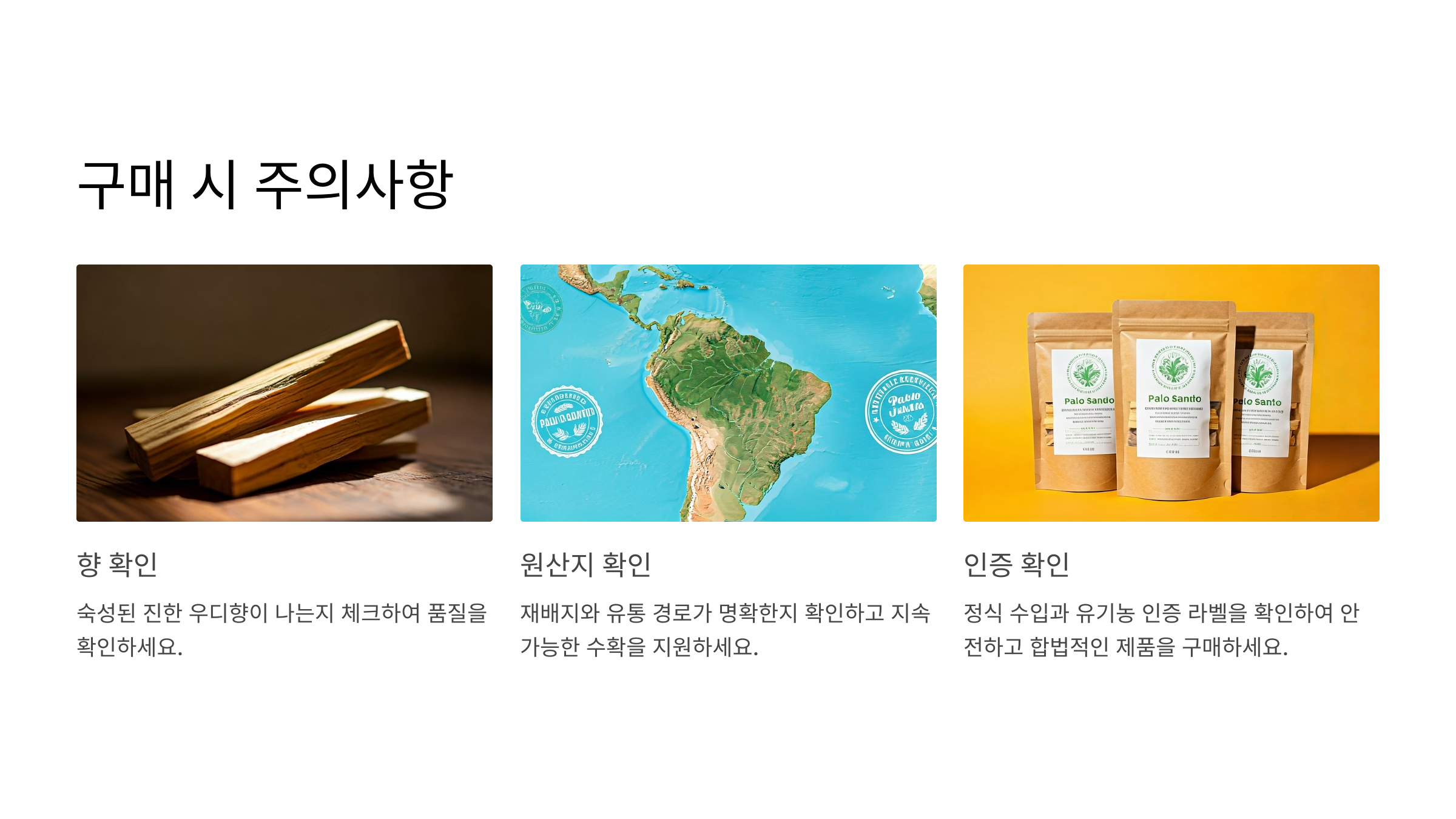 팔로산토를 구매할 땐 천연 숙성된 나무인지, 정품 인증이 있는지 꼭 확인하세요. 가짜 제품은 향이 인공적이고 효과도 떨어지기 때문에 아래 리스트를 참고해보세요.