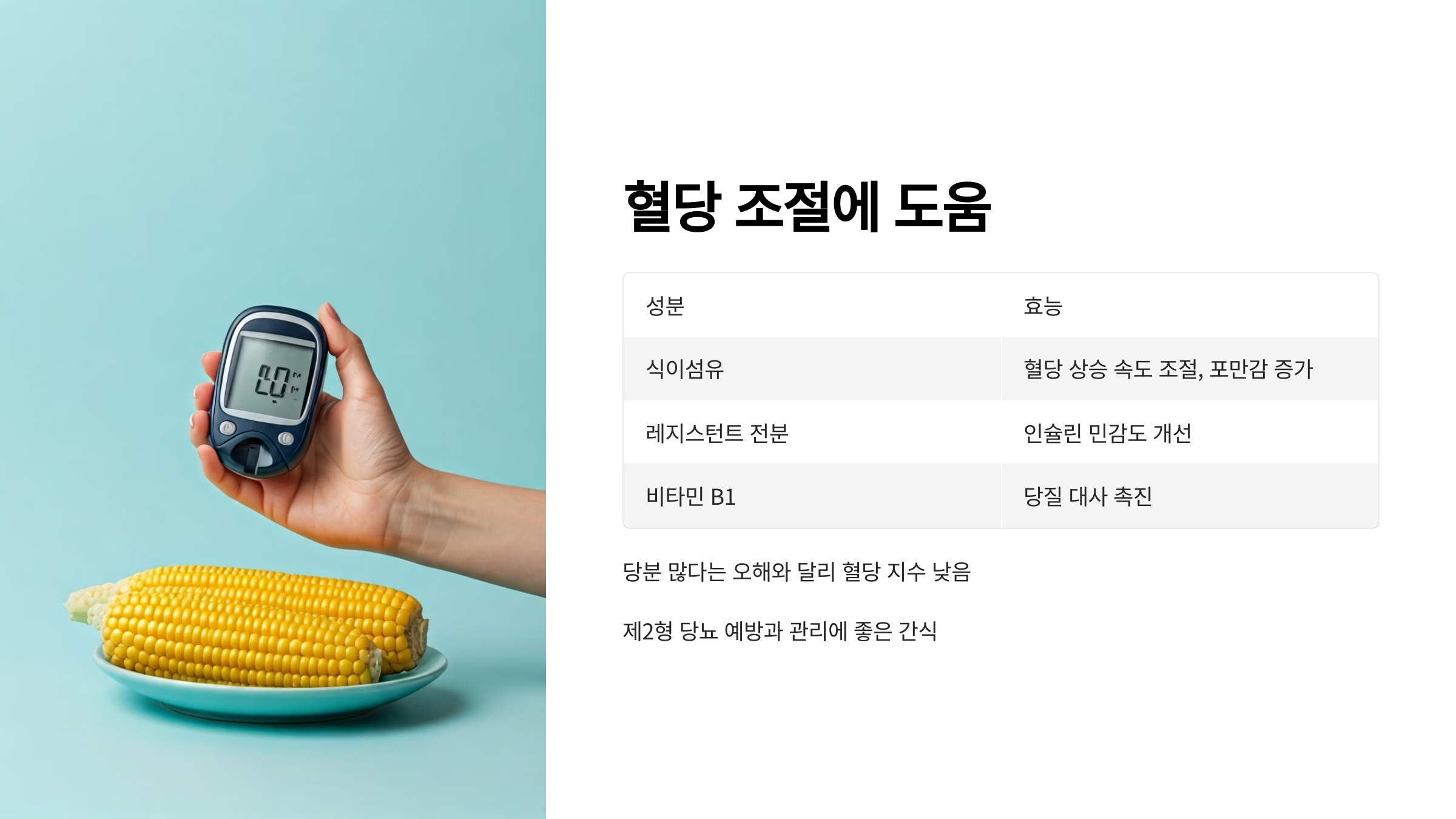 초당옥수수는 당분이 많다는 오해와 달리 혈당 지수가 낮고, 식이섬유가 풍부해 혈당을 천천히 올려줍니다. 특히 제2형 당뇨 예방과 관리에 있어 좋은 간식이 될 수 있어요. 아래는 주요 성분과 그 기능을 정리한 표입니다.