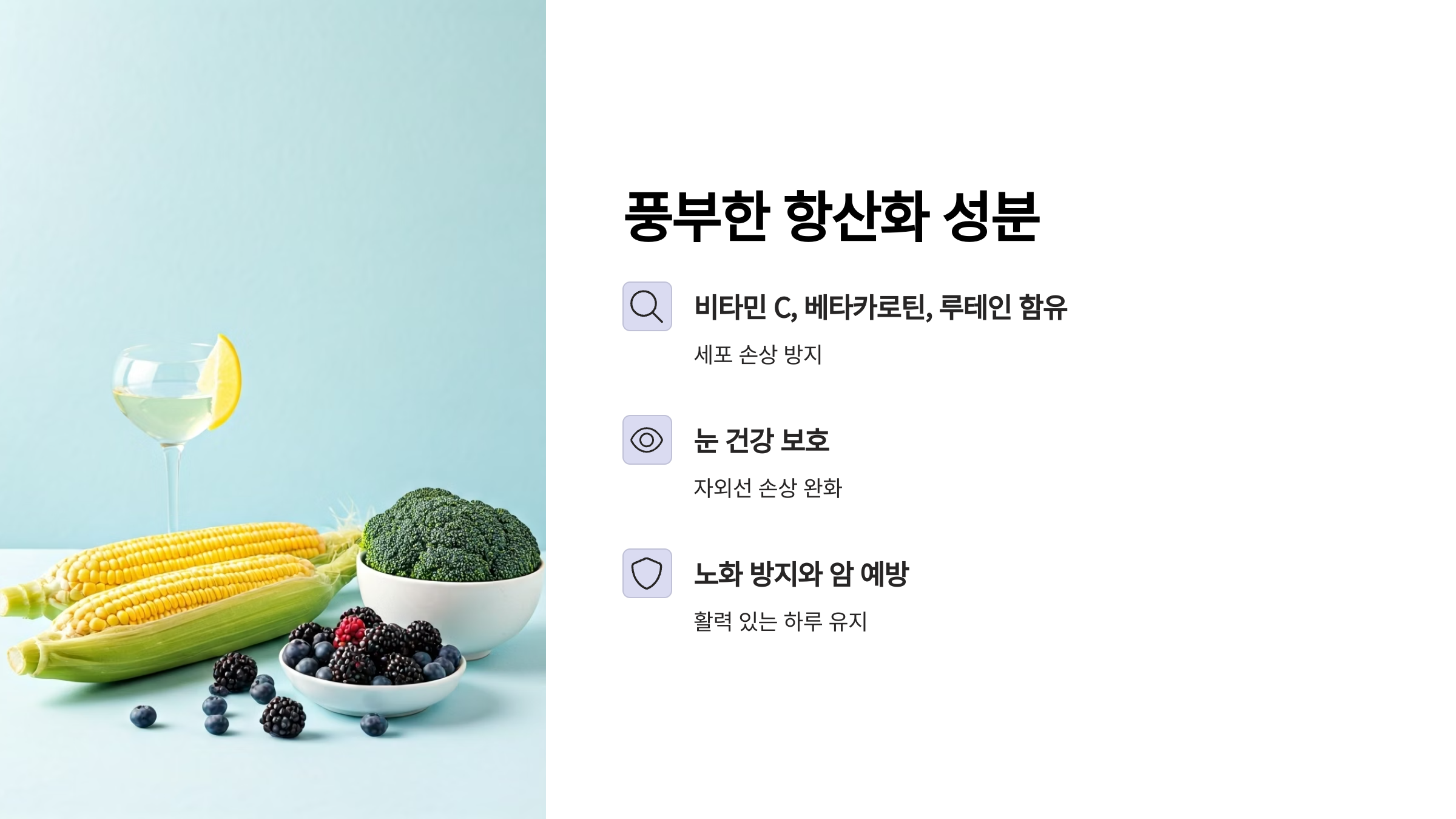 초당옥수수는 비타민 C, 베타카로틴, 루테인 등 다양한 항산화 성분이 풍부하게 들어 있어요. 이러한 성분들은 세포 손상을 막아주는 역할을 하며, 노화 방지와 암 예방에도 도움이 된답니다. 특히 루테인은 눈 건강을 보호해주며, 자외선으로 인한 손상 완화에도 효과적이에요. 꾸준히 섭취하면 활력 있는 하루를 유지하는 데 큰 도움이 됩니다.