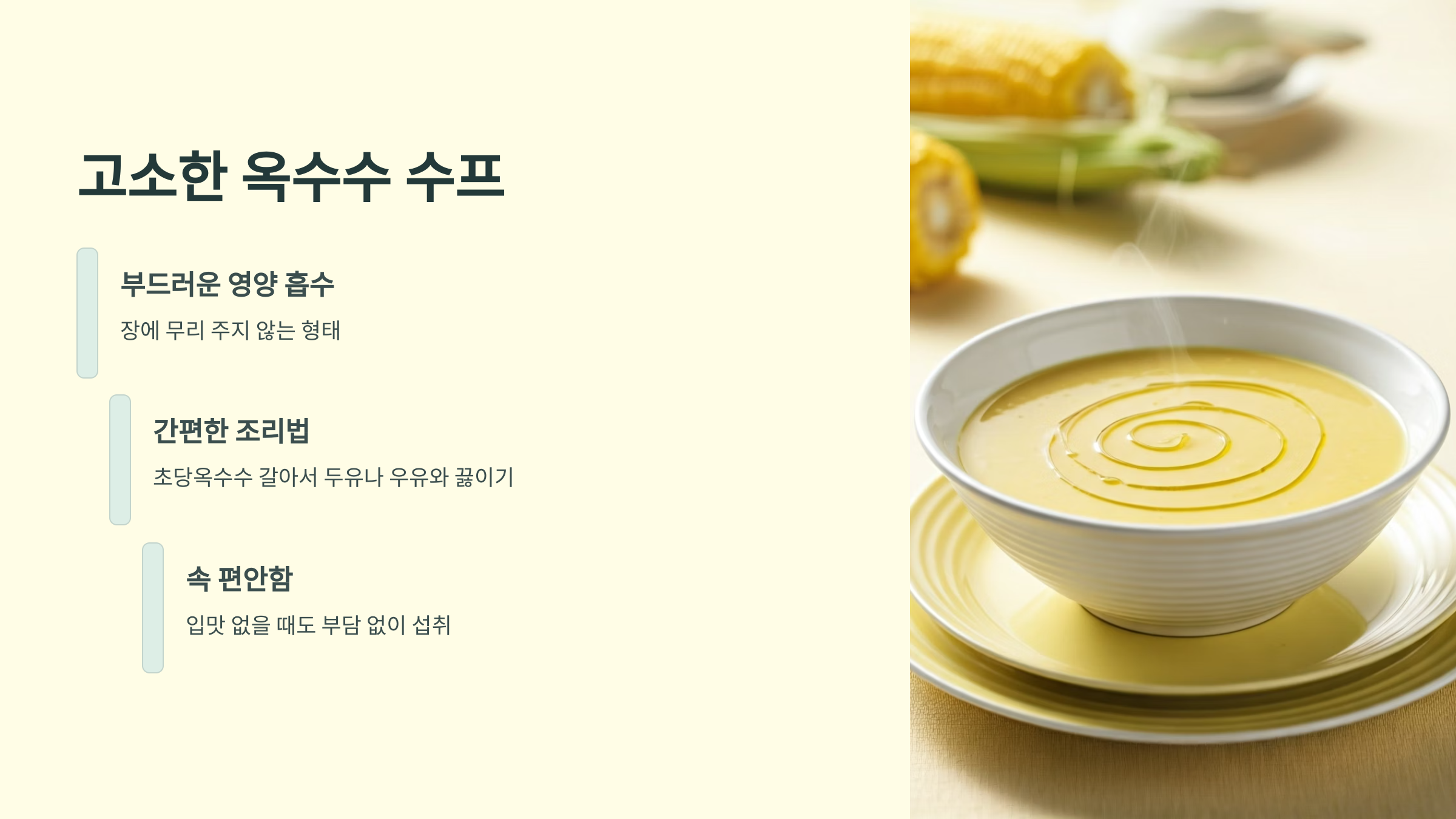 장에 무리를 주지 않으면서 부드럽게 영양을 흡수하고 싶다면 수프 형태가 제격이에요. 초당옥수수를 곱게 갈아 우유나 두유와 함께 끓여주면 고소하고 따뜻한 수프가 완성됩니다. 속이 불편할 때나 입맛 없을 때에도 부담 없이 즐길 수 있어요.