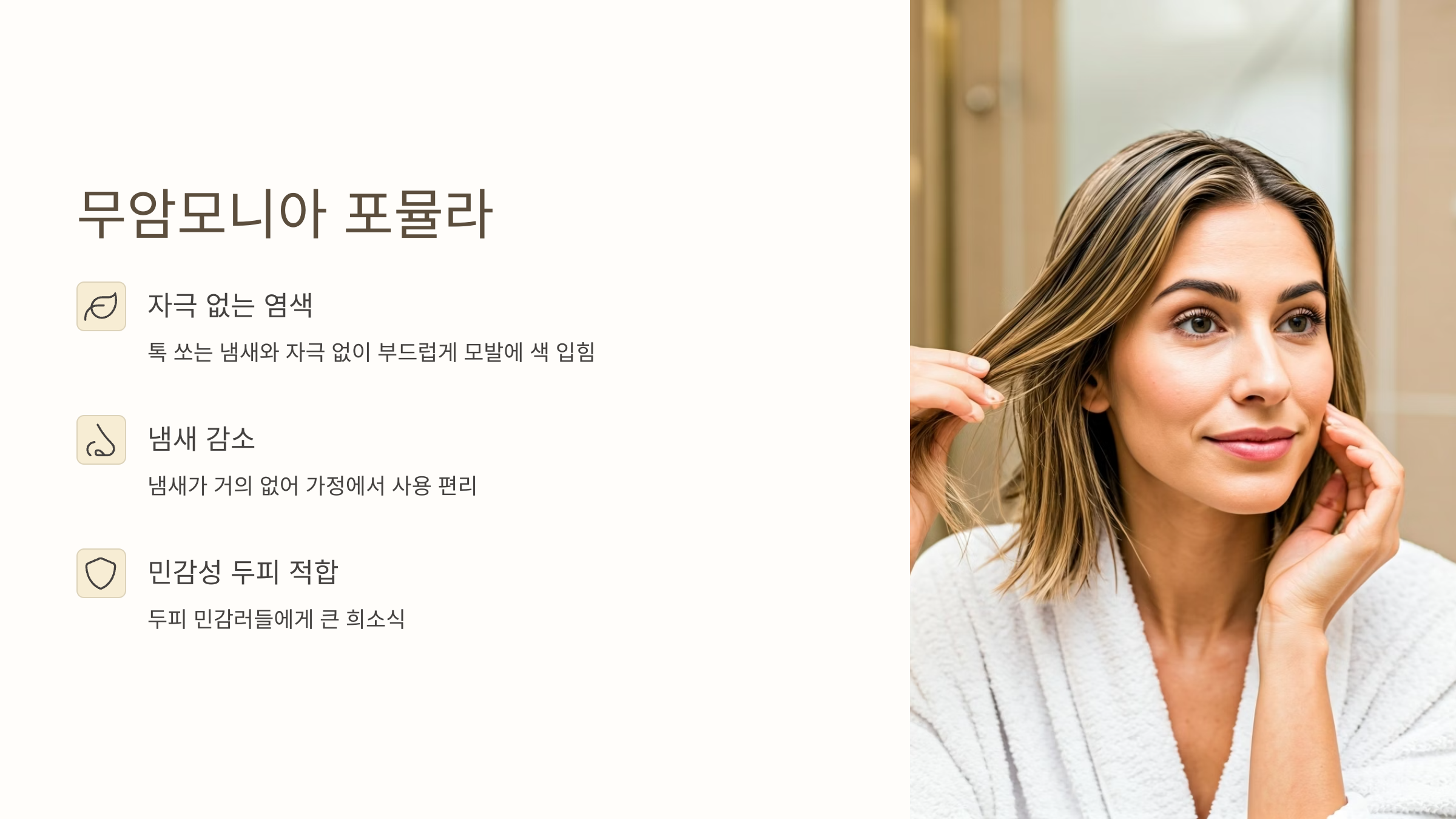 2025년 염색약 트렌드의 핵심은 무암모니아 포뮬라입니다. 전통적인 염색약의 톡 쏘는 냄새와 자극은 대부분 암모니아 때문인데요, 최근 제품들은 무암모니아 기반으로 자극 없이 부드럽게 모발에 색을 입혀줍니다. 냄새도 거의 없어 가정에서 사용하기에도 편리하며, 두피 민감러들에게는 큰 희소식이죠.