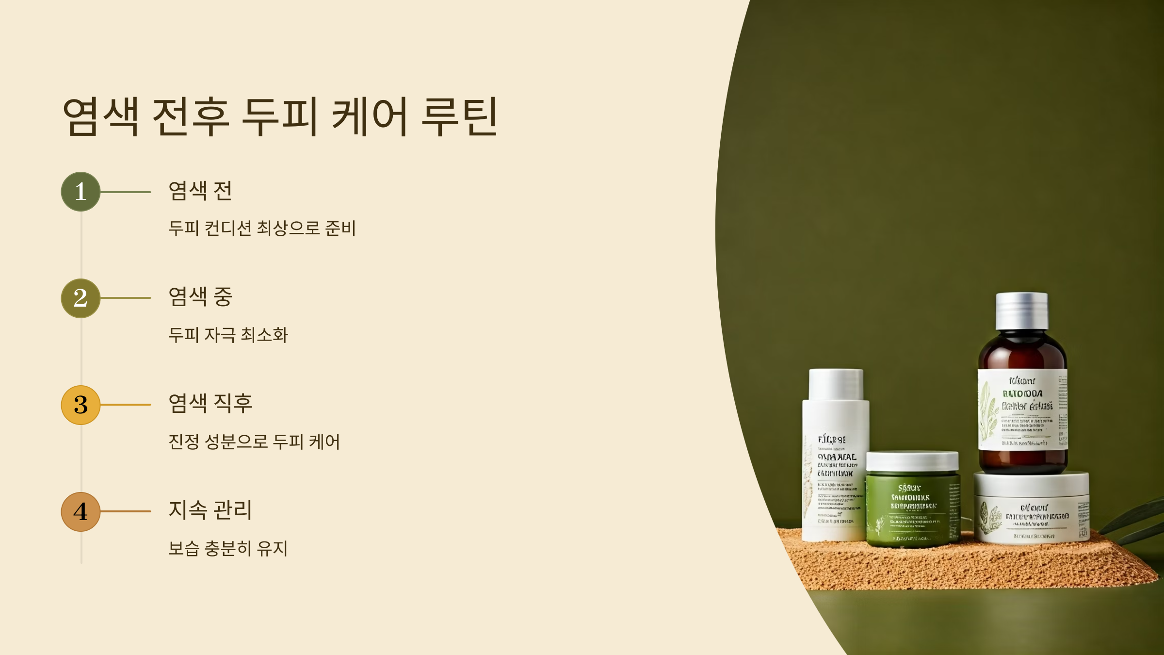 건강한 염색을 위해서는 염색 전과 후의 두피 관리가 정말 중요해요. 염색 전엔 두피 컨디션을 최상으로 만들어주고, 염색 후엔 자극을 진정시키고 보습을 충분히 해주는 것이 핵심입니다. 특히 민감성 두피라면 평소보다 더 신경 써야 하죠.