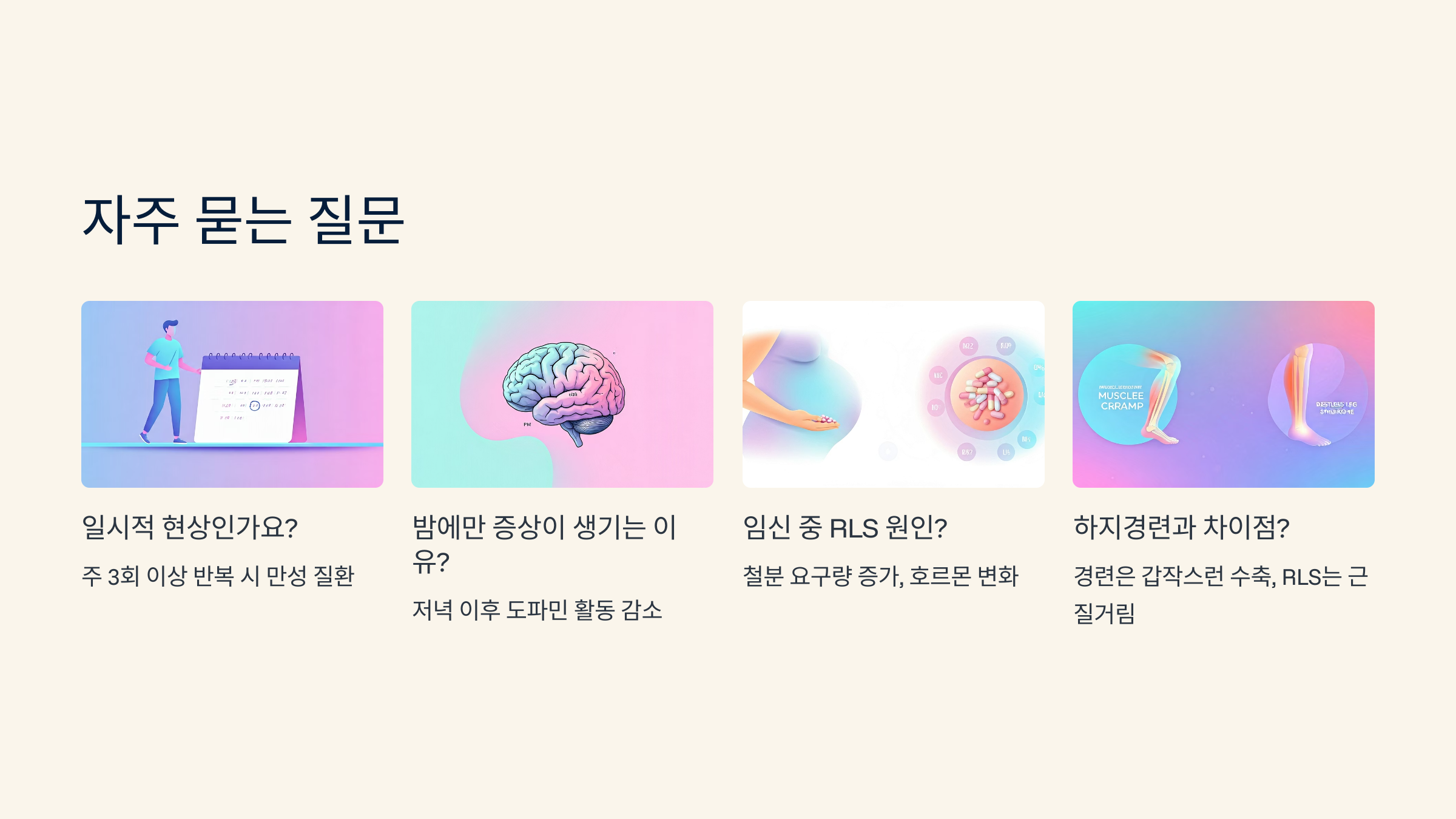 다릅니다. 하지경련은 갑작스럽고 고통스러운 수축이 특징이고, RLS는 근질거림이나 불쾌감이 서서히 나타나는 것이 특징입니다.