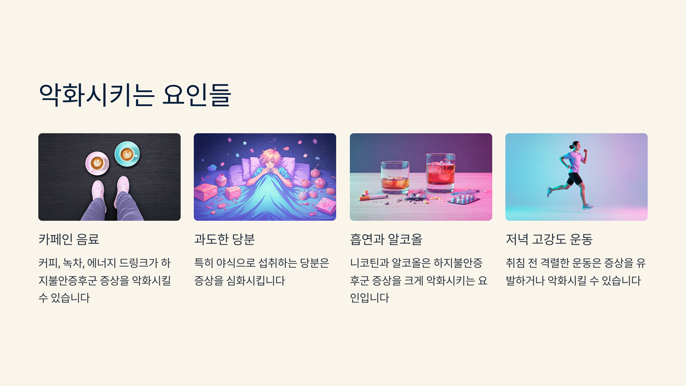 하지불안증후군은 특정 음식이나 습관에 의해 악화될 수 있습니다. 아래 항목은 가능한 피하는 것이 좋습니다.
