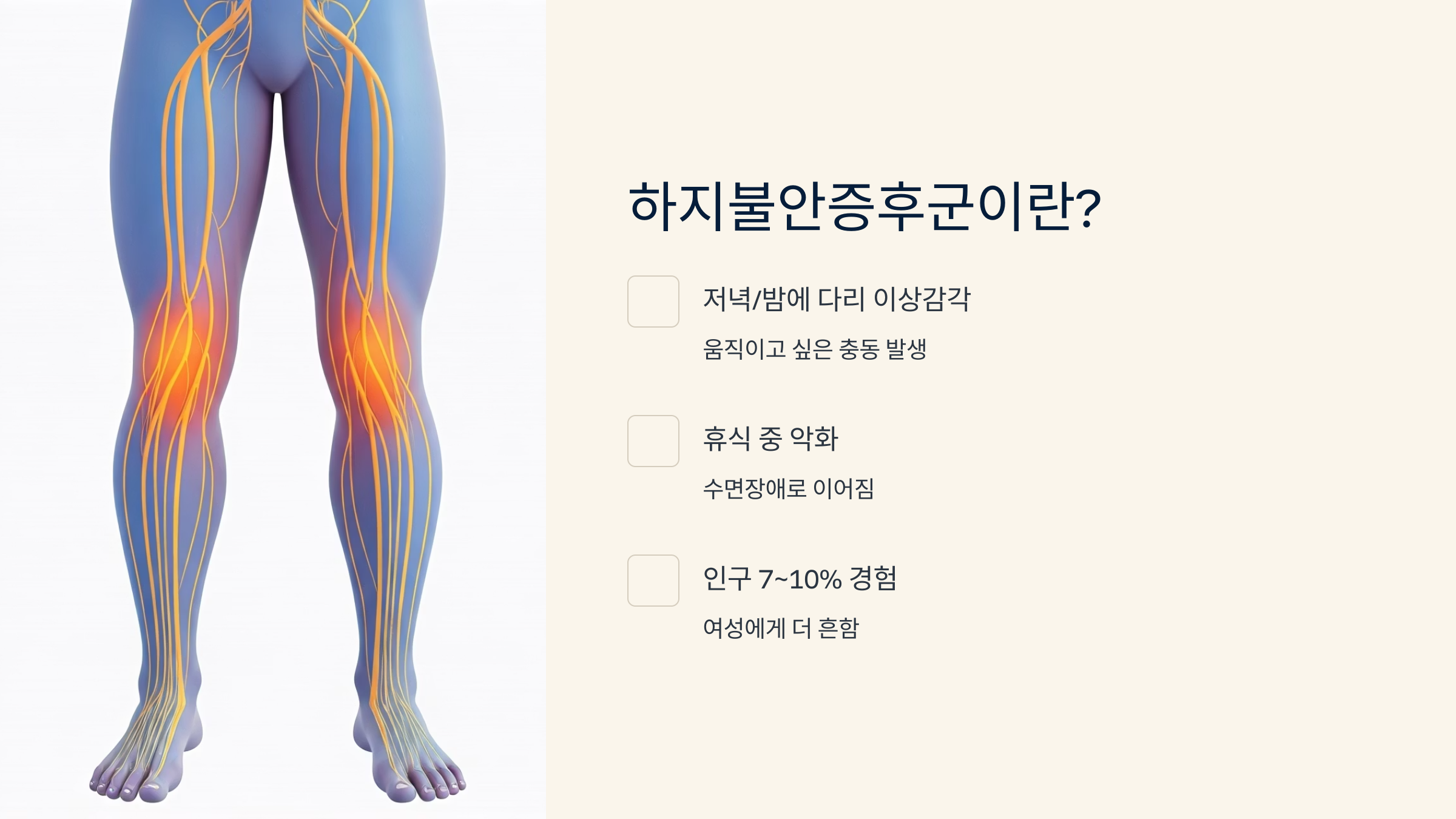 밤이 두려운 이유, 다리 불편감과 수면 방해로 삶의 질을 떨어뜨리는 하지불안증후군의 실체를 알아보세요.