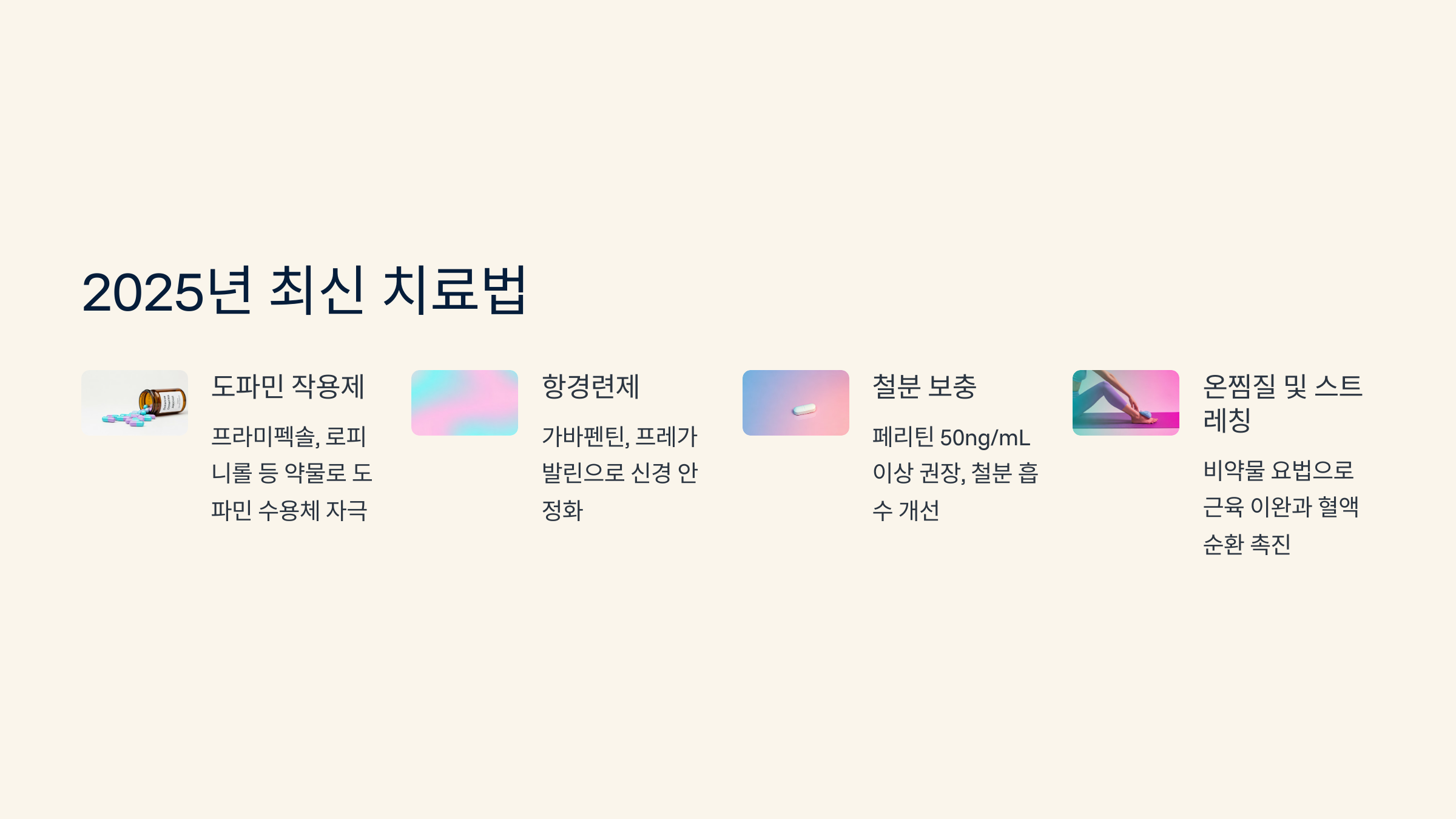 하지불안증후군 치료는 원인에 따라 약물치료와 생활습관 개선이 병행됩니다. 2025년 기준 최신 치료법은 다음과 같습니다.