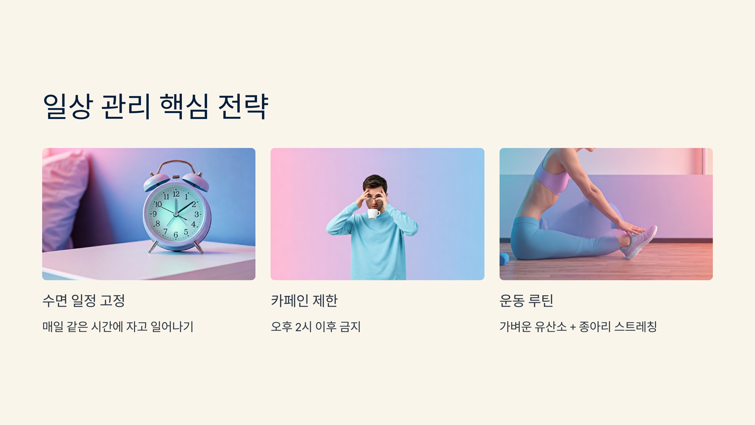 | 수면 일정 고정 | 매일 같은 시간에 자고 일어나기 |