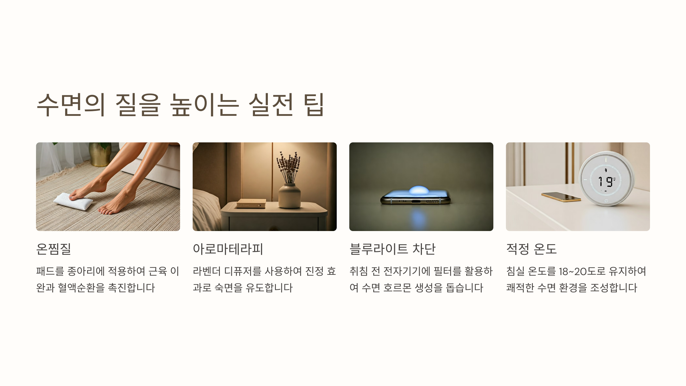 하지불안증후군으로 인해 수면이 방해될 때, 다음의 팁을 활용해보세요.