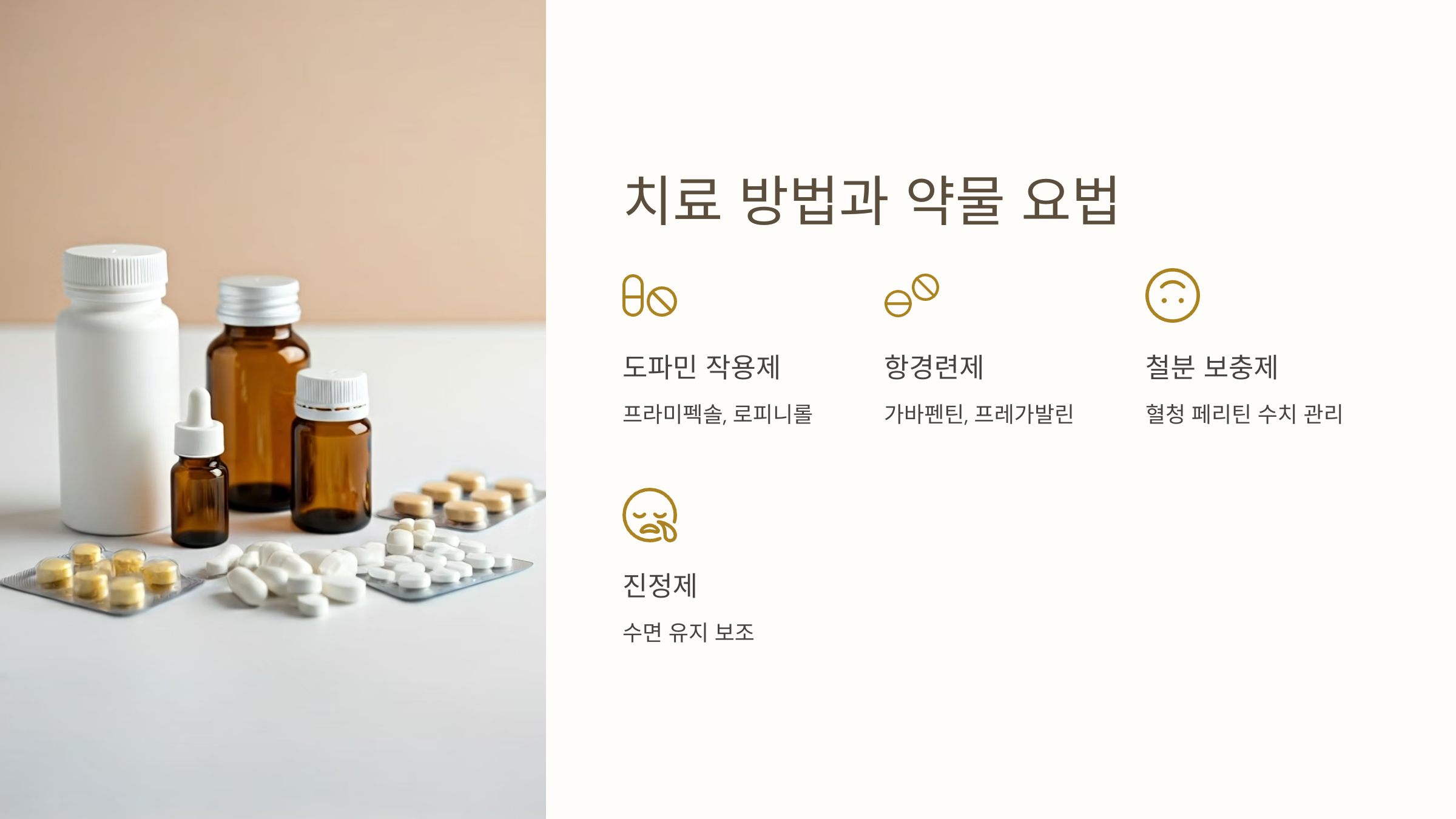 하지불안증후군 치료는 증상의 강도와 빈도에 따라 달라집니다. 일반적으로는 생활습관 교정과 함께 약물요법이 병행됩니다.