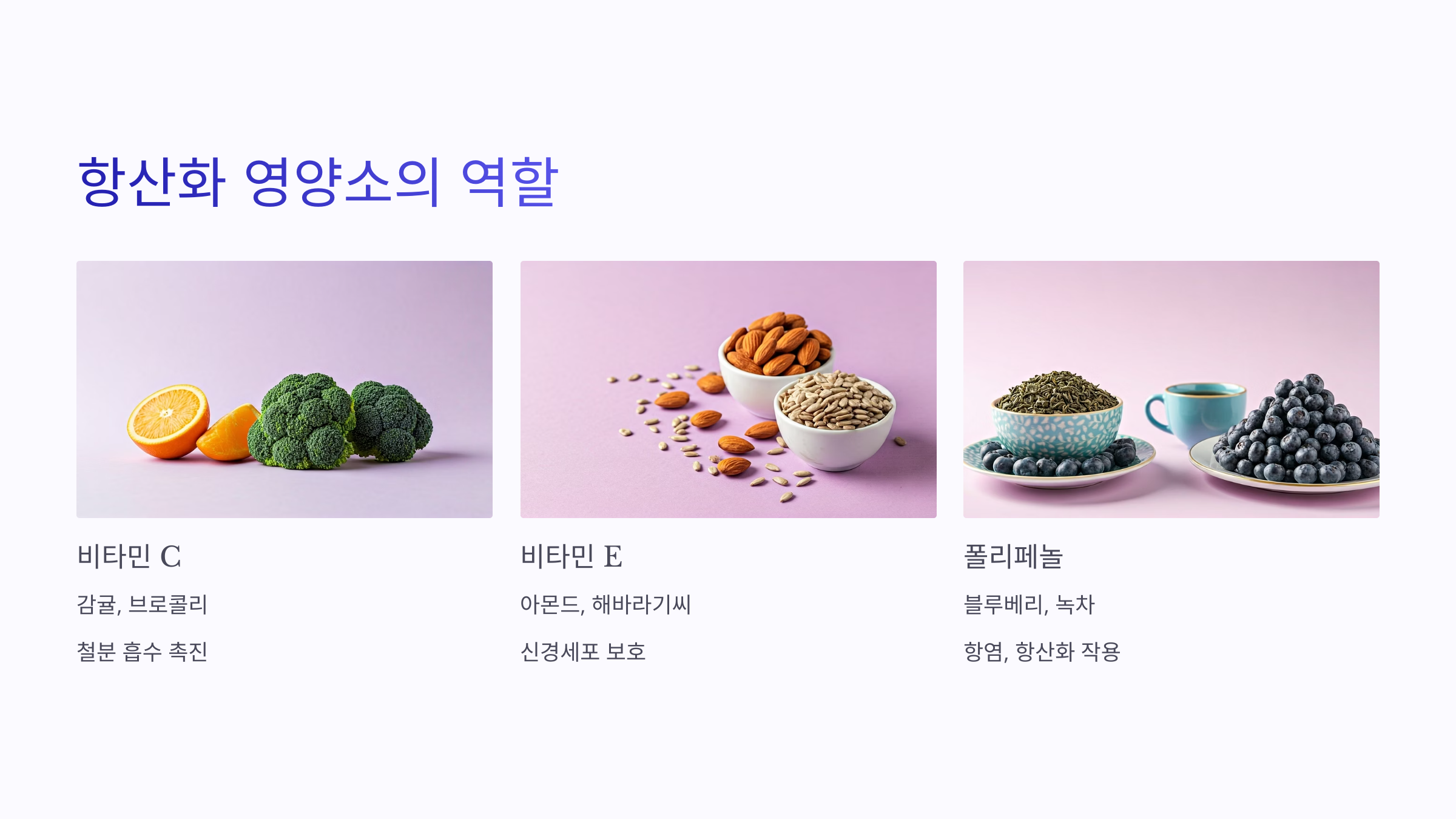 | 비타민 C | 감귤, 브로콜리 | 철분 흡수 촉진 |