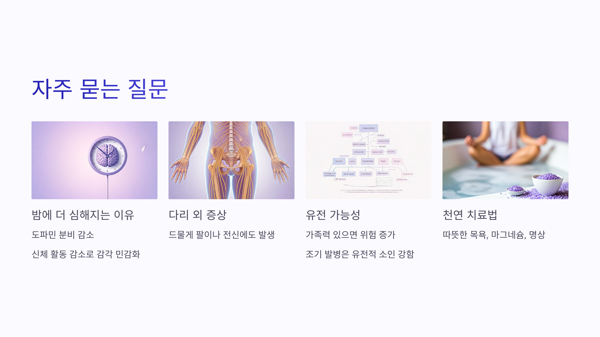 주로 다리에서 발생하지만, 드물게 팔이나 몸 전체에 비슷한 감각이 나타나는 경우도 있습니다.