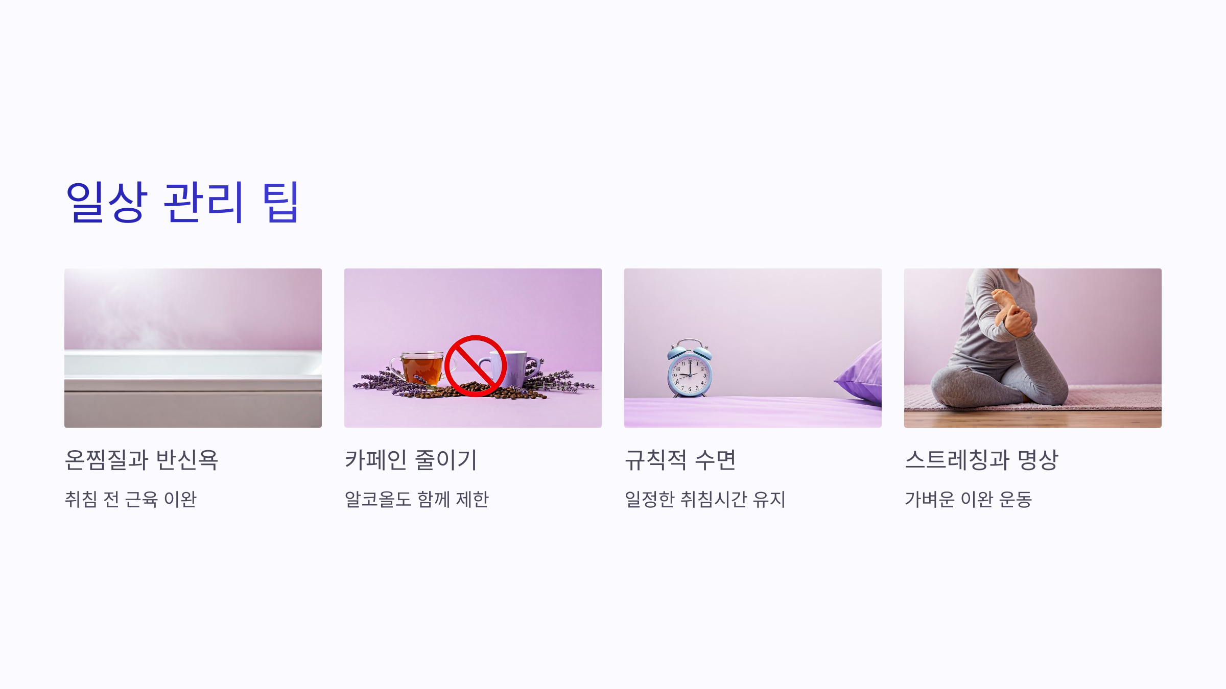 | 스트레칭 | 근육 긴장 완화 | 잠들기 30분 전 권장 |