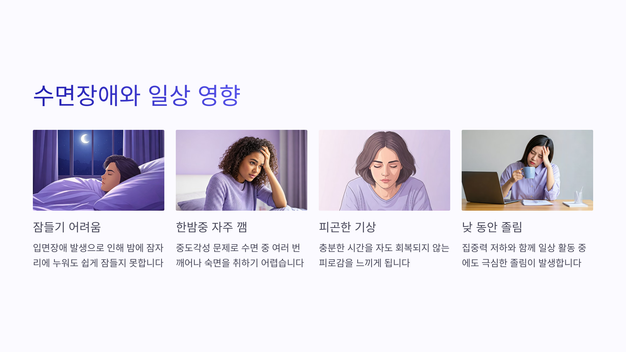 RLS는 수면장애로 이어지며, 그 여파는 낮 시간대까지 영향을 미칩니다. 아래는 흔히 보고되는 증상 목록입니다.