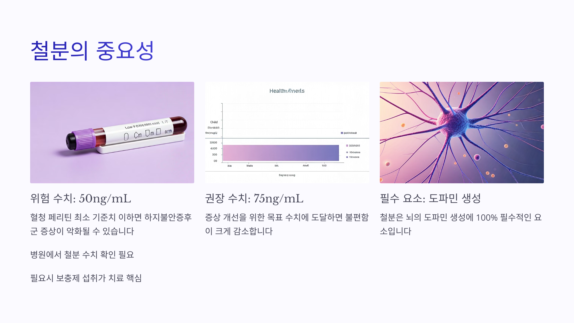 철분은 도파민 생성에 필수적인 미네랄로, 하지불안증후군 환자에게 있어 중요한 요소입니다. 특히 혈청 페리틴 수치가 50ng/mL 미만일 경우 증상이 악화되는 경향이 강하게 나타납니다. 병원에서 철분 수치를 확인하고 필요 시 보충제를 섭취하는 것이 치료의 핵심 중 하나입니다.