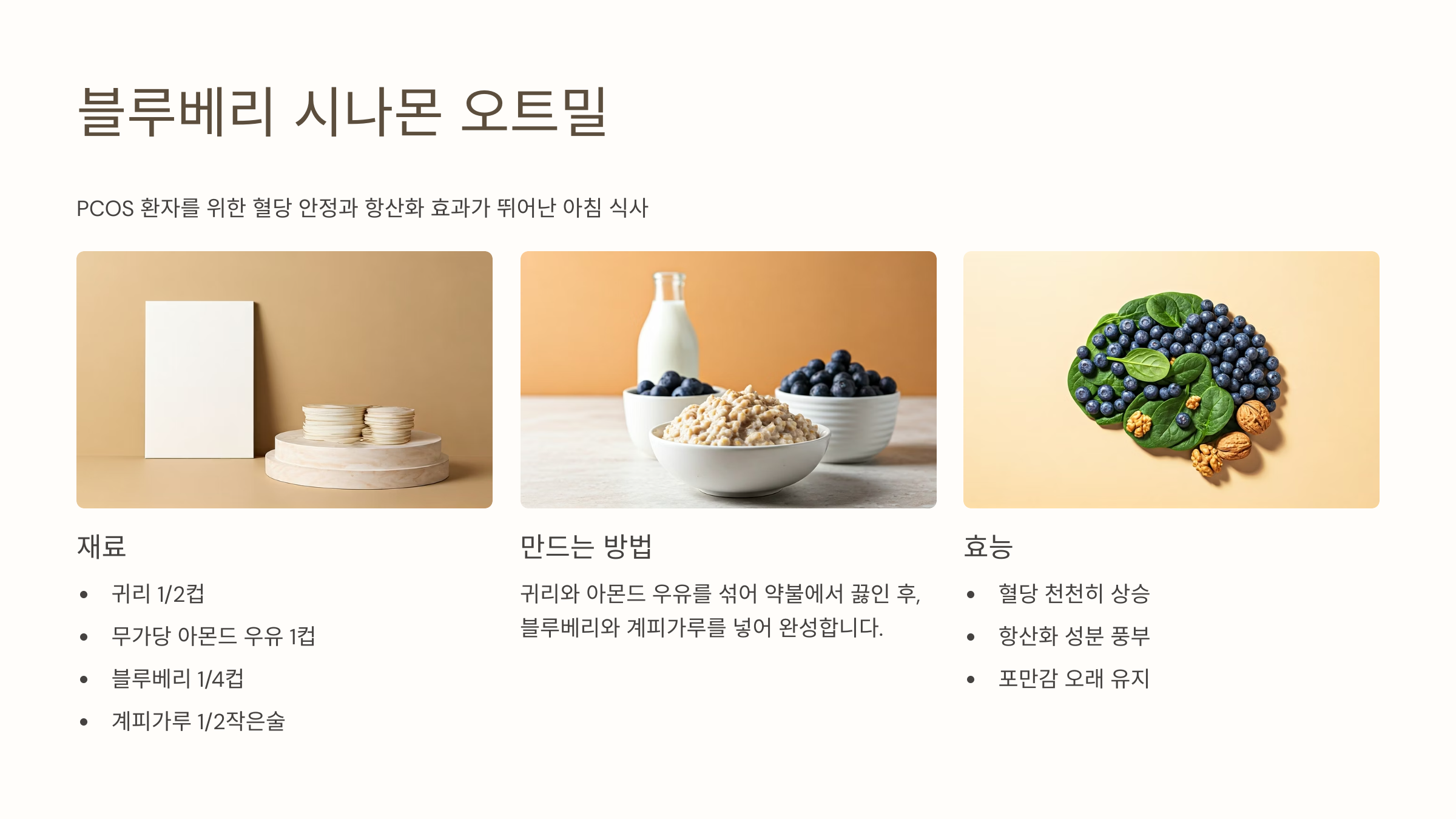 아침 식사로 좋은 항산화 듬뿍 메뉴! 혈당을 천천히 올리는 귀리에 항산화제 블루베리, 그리고 혈당 안정 효과가 있는 시나몬까지 더했어요.