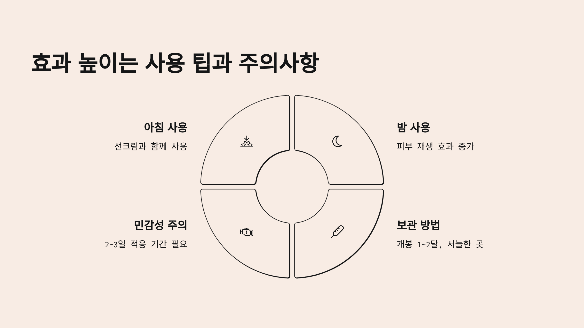 아침 사용 시 자외선 차단제는 필수예요. 밤에는 피부 재생과 함께 흡수가 더 잘 되니, 하루 2회 사용도 OK! 단, 민감 피부는 2~3일 간격으로 적응기를 거쳐야 하며, 항산화 효과를 위해 개봉 후 1~2달 내 빠른 사용을 권장합니다. 보관은 냉장고보단 서늘하고 어두운 곳이 좋아요.