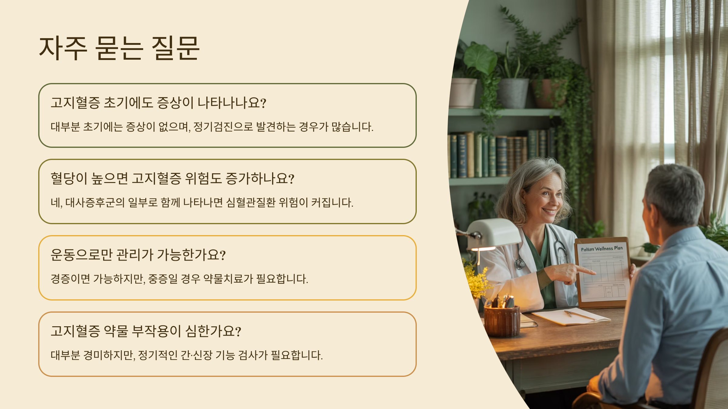 오늘은 고지혈증의 5가지 대표 증상과 그에 맞는 대처법, 그리고 혈당까지 함께 관리하는 예방 전략을 소개했습니다. 실제로 저도 이 글을 준비하면서 식단과 생활습관을 다시 점검하게 되었어요. 고지혈증은 조기에 발견해 관리하면 충분히 위험을 줄일 수 있는 질환입니다. 작은 생활 습관의 변화가 내일의 건강을 지키는 가장 확실한 방법이라는 점, 꼭 기억하시길 바랍니다. 댓글로 여러분의 관리 노하우나 경험담을 나눠 주시면 더 많은 분들에게 도움이 될 거예요.