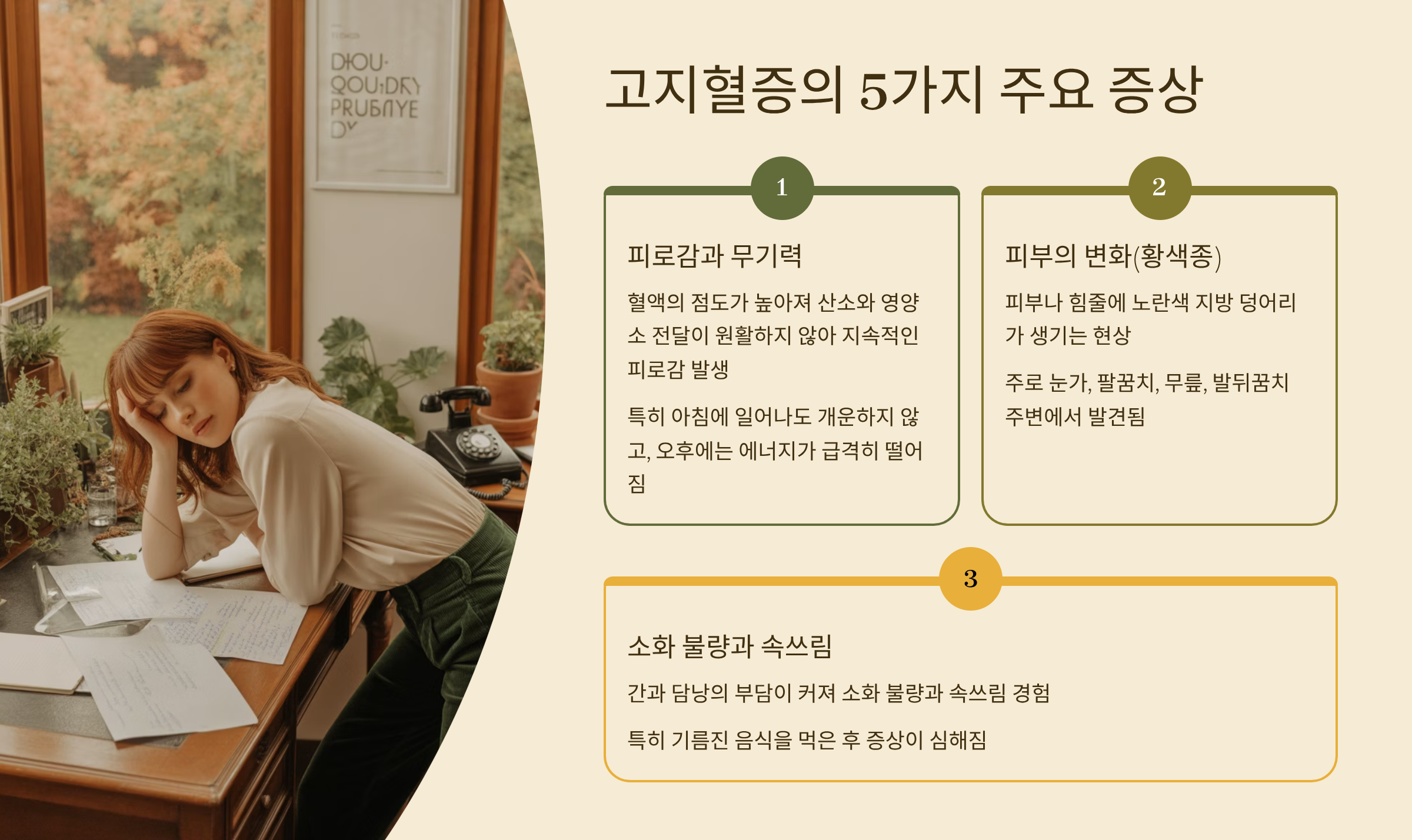 고지혈증이 심해지면 혈액의 점도가 높아져 산소와 영양소 전달이 원활하지 않아 피로감과 무기력이 지속될 수 있습니다. 특히 아침에 일어나도 개운하지 않고, 오후에는 에너지가 급격히 떨어지는 경우가 많습니다. 이를 개선하려면 규칙적인 수면과 더불어 혈액순환을 돕는 가벼운 유산소 운동을 습관화해야 합니다.