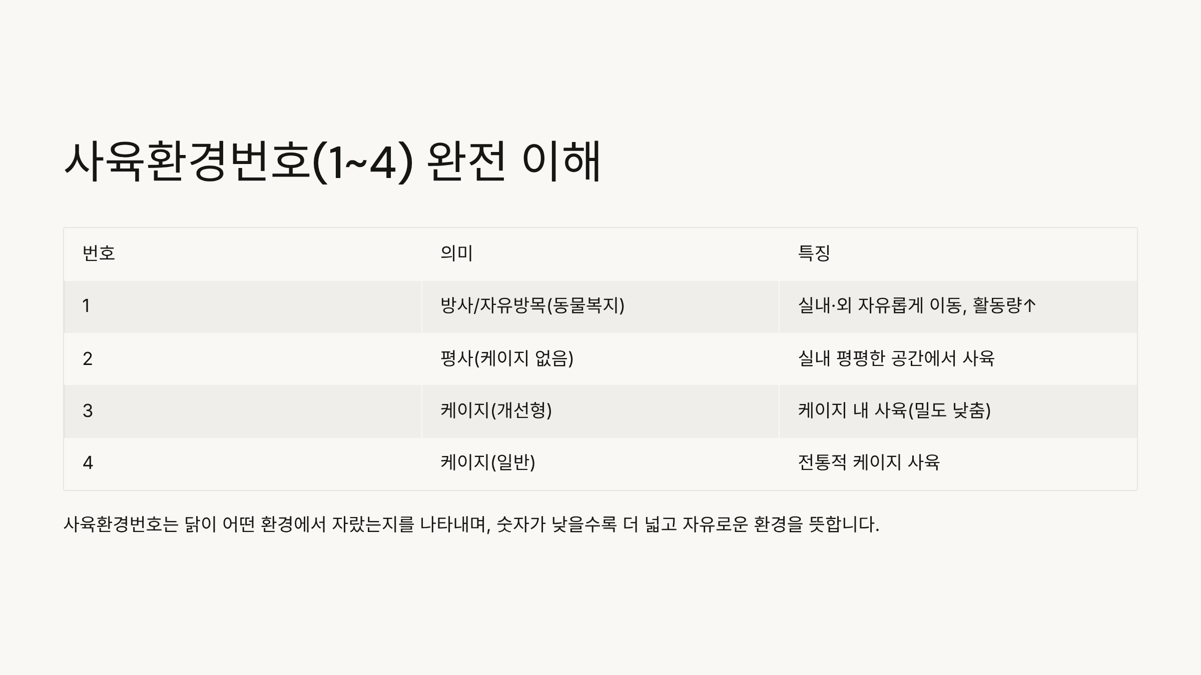 사육환경번호는 닭이 어떤 환경에서 자랐는지를 나타내며, 숫자가 낮을수록 더 넓고 자유로운 환경을 뜻합니다. 아래 표로 핵심만 정리했어요. :contentReference[oaicite:1]{index=1}
