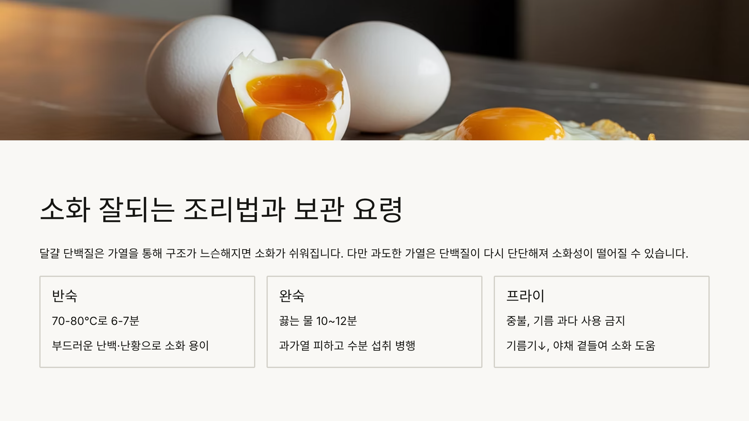 달걀 단백질은 가열을 통해 구조가 느슨해지면 소화가 쉬워집니다. 다만 과도한 가열은 단백질이 다시 단단해져 소화성이 떨어질 수 있어요. :contentReference[oaicite:4]{index=4}