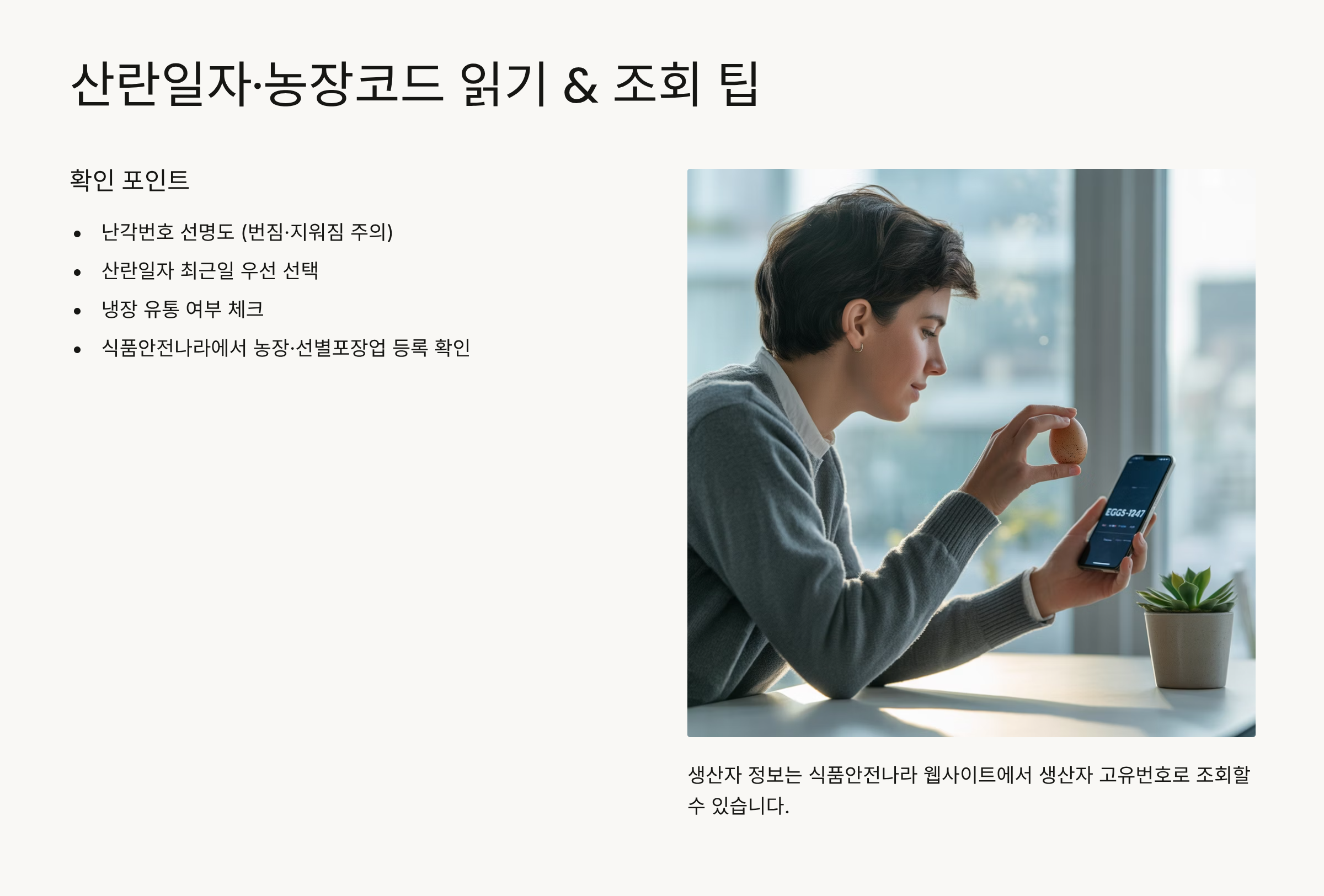 난각번호는 복잡해 보이지만, 사실 다섯 가지 포인트만 알면 끝—산란일자, 농장코드, 사육환경번호, 위·변조 여부, 냉장 유통. 여기에 유정·무정 구분은 취향과 예산, 신선도로 결정하고요. 소화는 “적당히 익힌 달걀”이 최고였다는 것, 기억해 두면 일상이 훨씬 편해집니다. 오늘 장볼 때 한 번만 더 자세히 들여다보세요. 여러분의 식탁이 눈에 띄게 달라질 거예요. 😉
