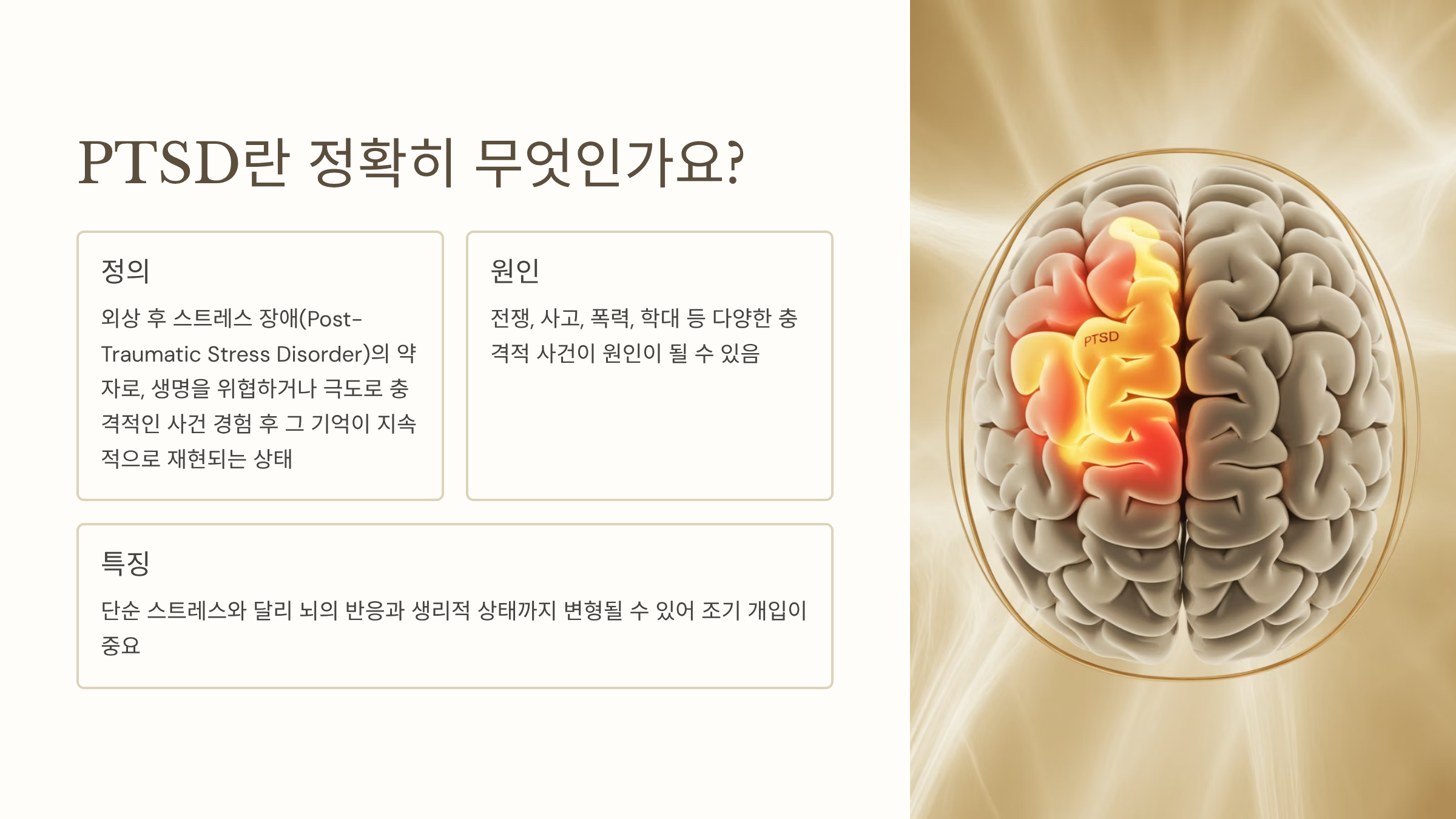 PTSD는 외상 후 스트레스 장애(Post-Traumatic Stress Disorder)의 약자예요. 생명을 위협하거나 극도로 충격적인 사건을 경험한 뒤, 그 기억이 지속적으로 재현되고 일상생활에까지 영향을 주는 상태를 말하죠. 전쟁, 사고, 폭력, 학대 등 다양한 사건이 원인이 될 수 있어요. 단순한 스트레스와는 달리, 뇌의 반응과 생리적 상태까지 변형될 수 있기 때문에 조기 개입이 매우 중요합니다.