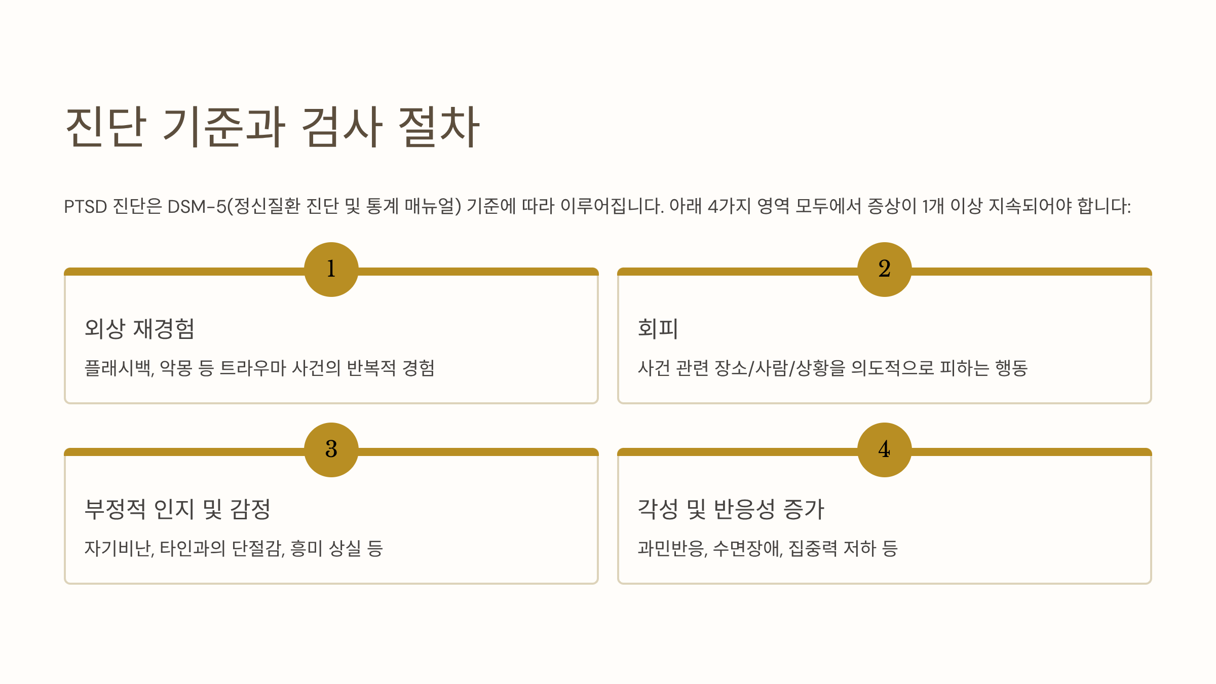 PTSD 진단은 DSM-5(정신질환 진단 및 통계 매뉴얼) 기준에 따라 이뤄져요. 진단은 단순히 ‘무섭고 힘들었다’는 주관적 경험이 아니라, 일정 기간 이상 반복되는 특정 행동, 감정 반응을 기준으로 하죠.