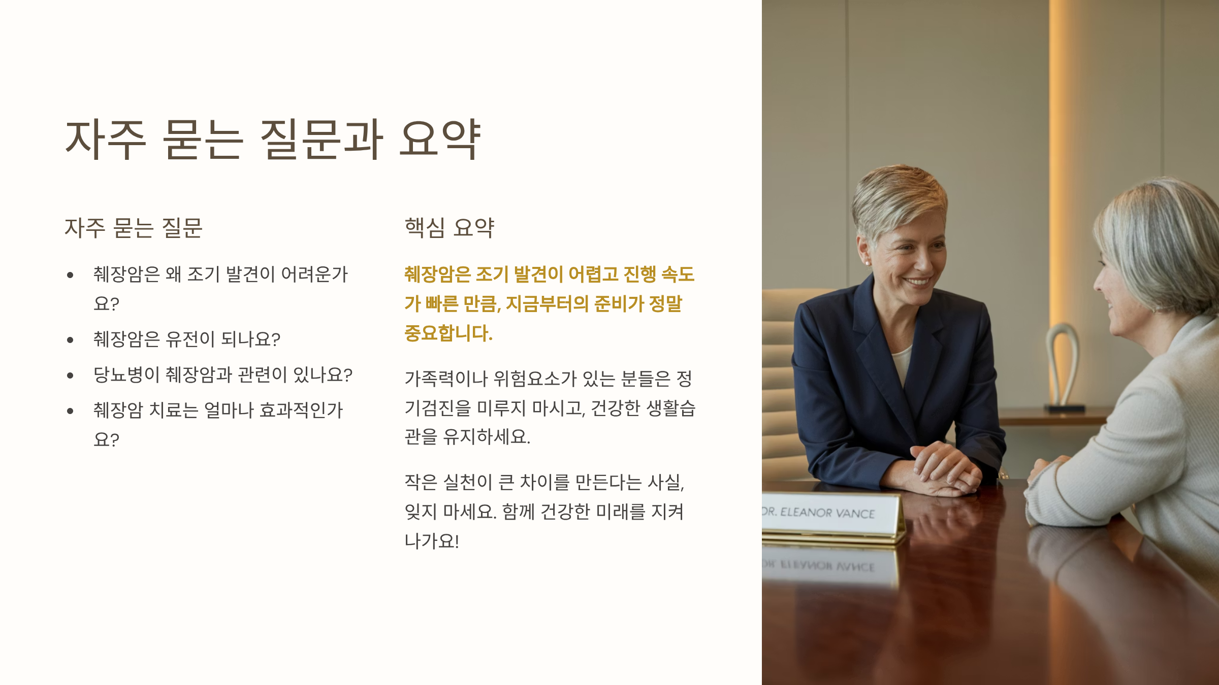 췌장암은 조기 발견이 어렵고 진행 속도가 빠른 만큼, 지금부터의 준비가 정말 중요합니다. 오늘 소개한 7가지 필수 정보를 통해 췌장암에 대한 두려움을 줄이고, 예방과 조기진단의 중요성을 다시 한 번 되새겨보세요. 가족력이나 위험요소가 있는 분들은 정기검진을 미루지 마시고요. 작은 실천이 큰 차이를 만든다는 사실, 잊지 마세요. 함께 건강한 미래를 지켜나가요!