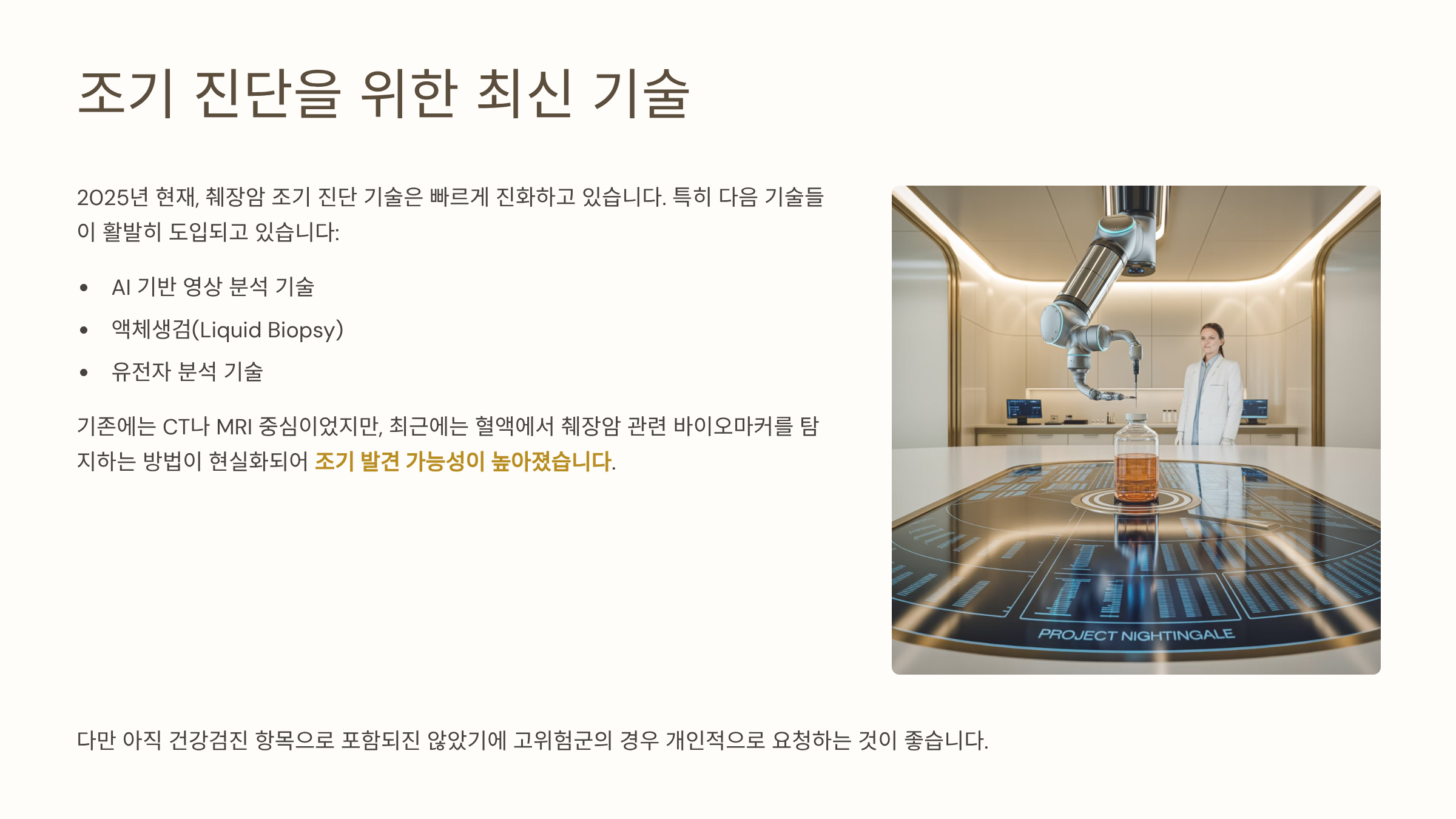 2025년 현재, 췌장암 조기 진단 기술은 빠르게 진화하고 있어요. 특히 AI 기반 영상 분석, 액체생검(Liquid Biopsy), 유전자 분석 기술이 활발히 도입되고 있습니다. 기존에는 CT나 MRI 중심이었지만, 최근에는 혈액에서 췌장암 관련 바이오마커를 탐지하는 방법이 현실화되어 조기 발견 가능성이 높아졌죠. 다만 아직 건강검진 항목으로 포함되진 않았기에 고위험군의 경우 개인적으로 요청하는 것이 좋아요.