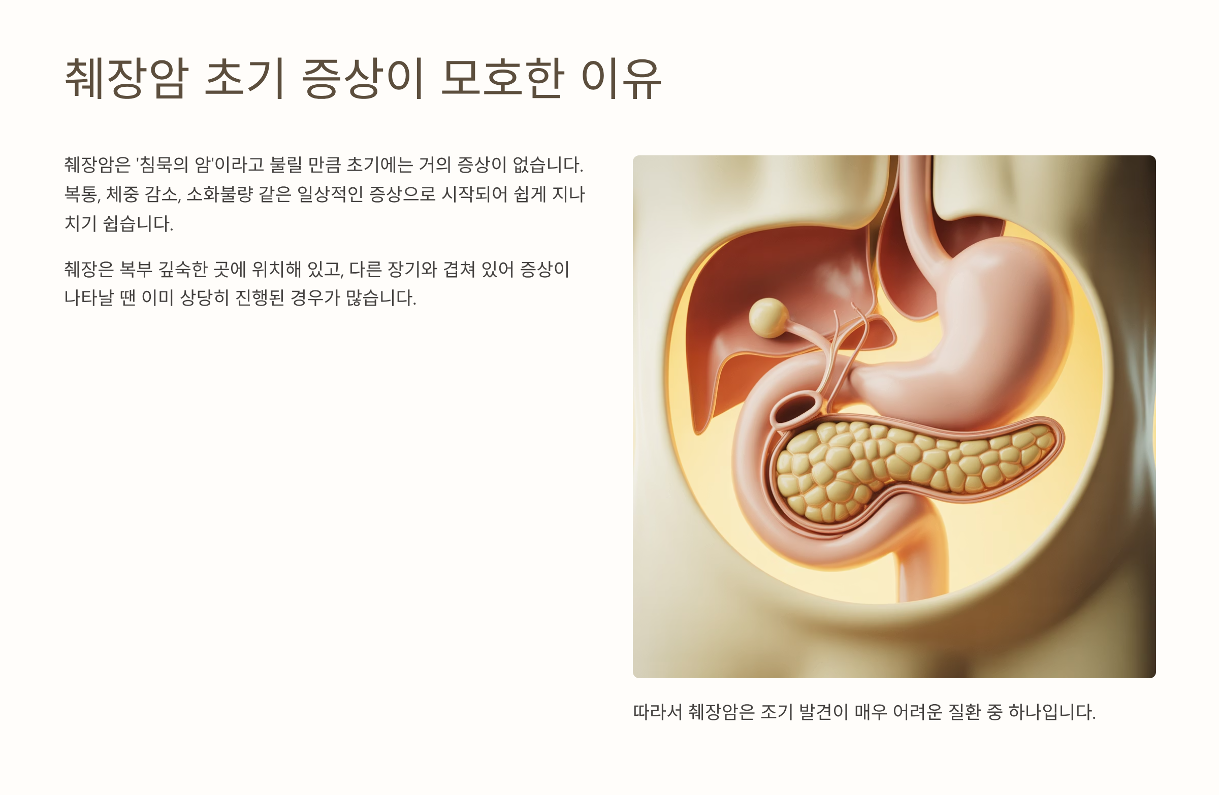 췌장은 신체 깊숙한 곳에 위치해 초기 증상이 없거나 매우 모호해서 발견 시 이미 진행된 경우가 많습니다.