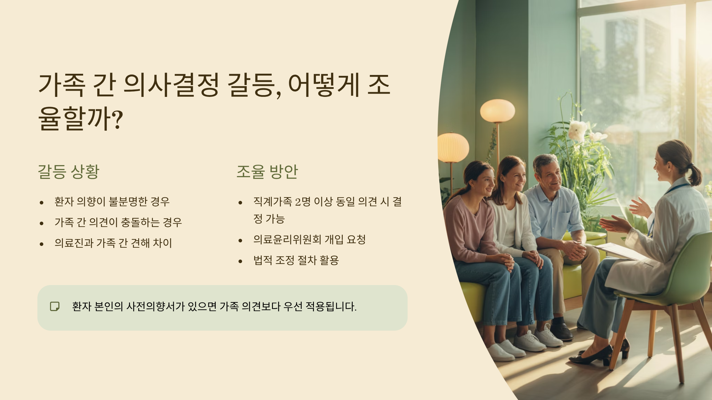 | 가족 간 의견 충돌 | 의료윤리위원회 또는 법적 조정 절차 |