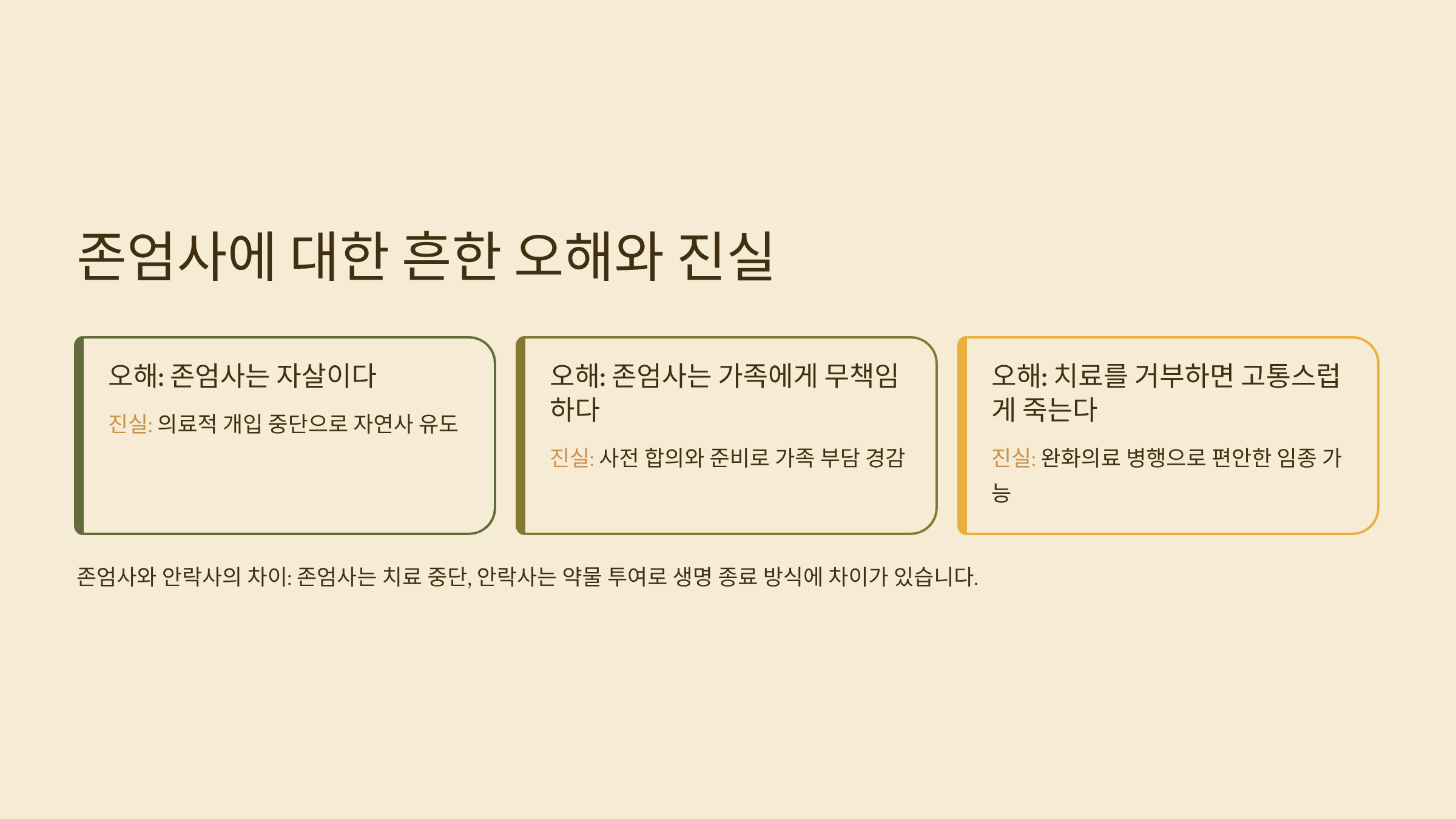 - 오해: 존엄사는 자살이다 → 진실: 의료적 개입 중단으로 자연사 유도