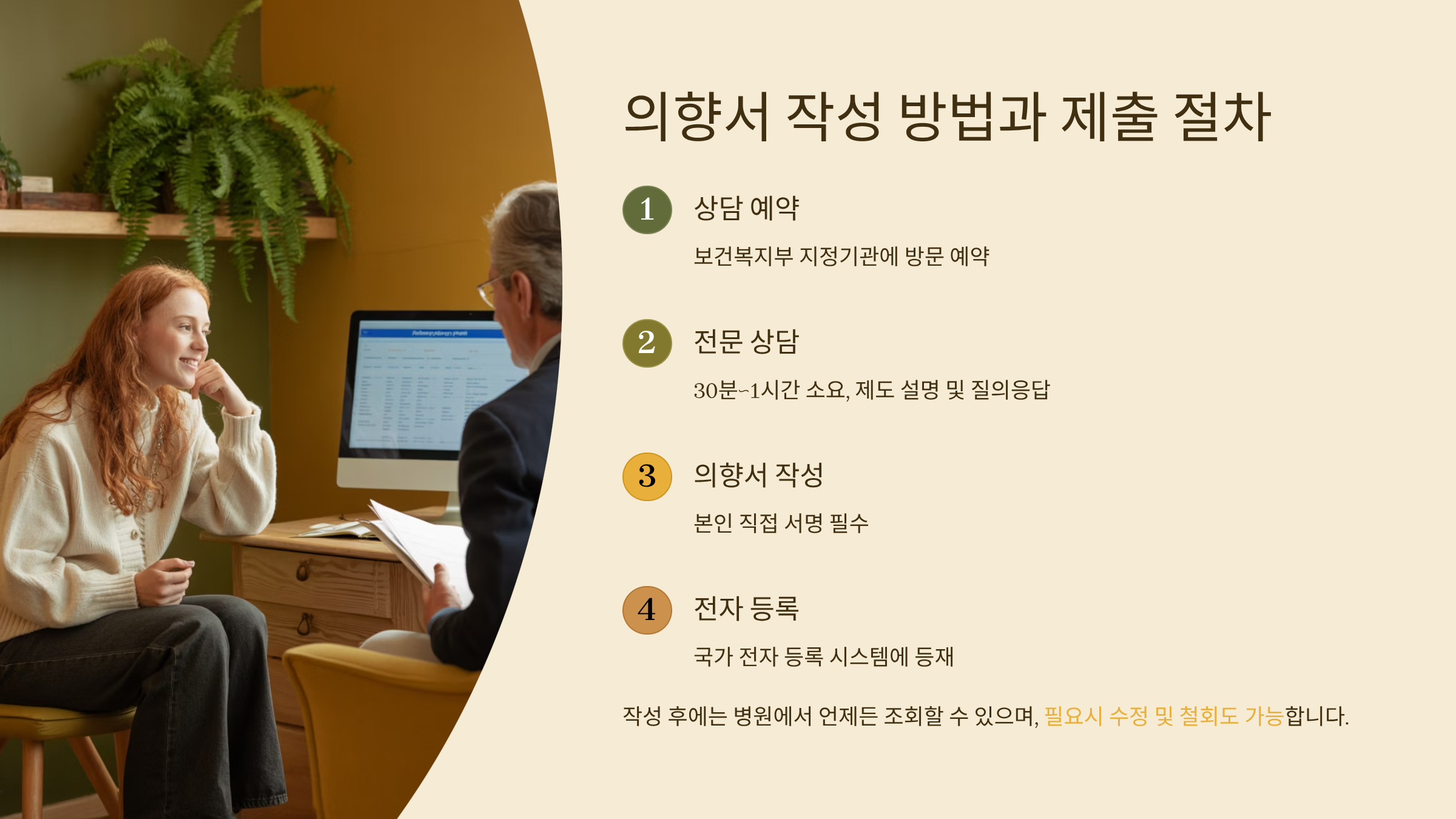 사전연명의료의향서를 작성하려면 먼저 보건복지부 지정기관에서 전문 상담을 받아야 합니다. 상담은 30분에서 1시간 정도 소요되며, 작성자는 직접 본인의 의사를 확인 후 서명해야 합니다. 작성 후에는 국가 전자 등록 시스템에 등재되어 병원에서 언제든 조회할 수 있습니다.