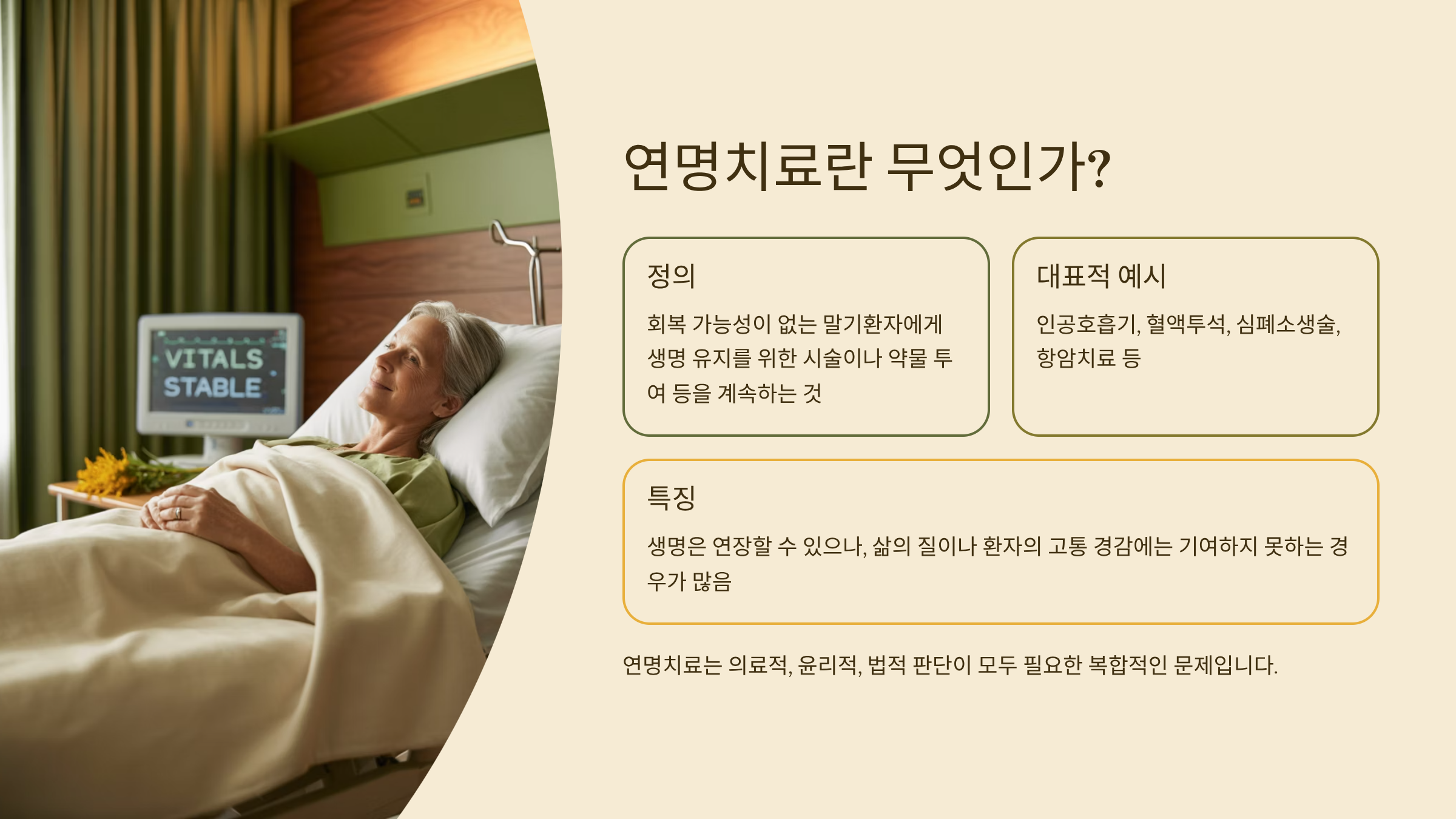 연명치료란, 회복 가능성이 없는 말기환자에게 생명 유지를 위한 시술이나 약물 투여 등을 계속하는 것을 말합니다. 인공호흡기, 혈액투석, 심폐소생술, 항암치료 등이 대표적입니다. 이는 생명을 연장할 수는 있지만, 삶의 질이나 환자의 고통 경감에는 기여하지 못하는 경우가 많죠. 따라서 의료적, 윤리적, 법적 판단이 모두 필요합니다.