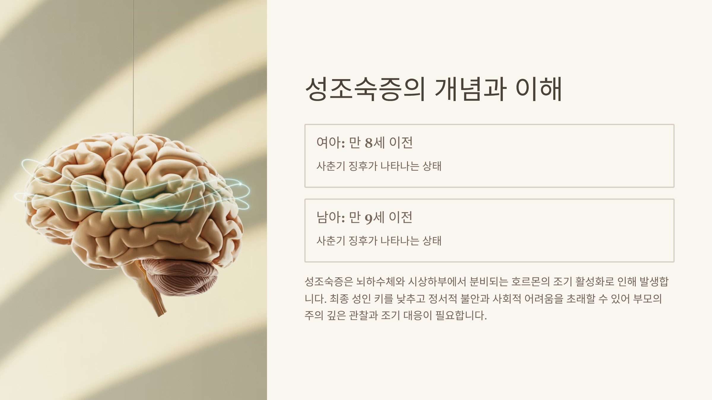 안녕하세요. 요즘 학부모들 사이에서 가장 큰 관심사 중 하나가 바로 성조숙증입니다. 저 역시 주변 아이들이 급격히 성장하는 모습을 보면서 ‘혹시 우리 아이도 성조숙증이 아닐까?’라는 걱정을 하게 되었는데요. 성조숙증은 단순히 성장 속도가 빠른 것이 아니라, 호르몬 불균형과 미래 건강까지 영향을 미치는 중요한 문제입니다. 이번 글에서는 성조숙증의 원인과 증상, 그리고 치료와 예방에 관한 핵심 비밀을 담아 부모님들께 꼭 필요한 정보를 드리려고 합니다.