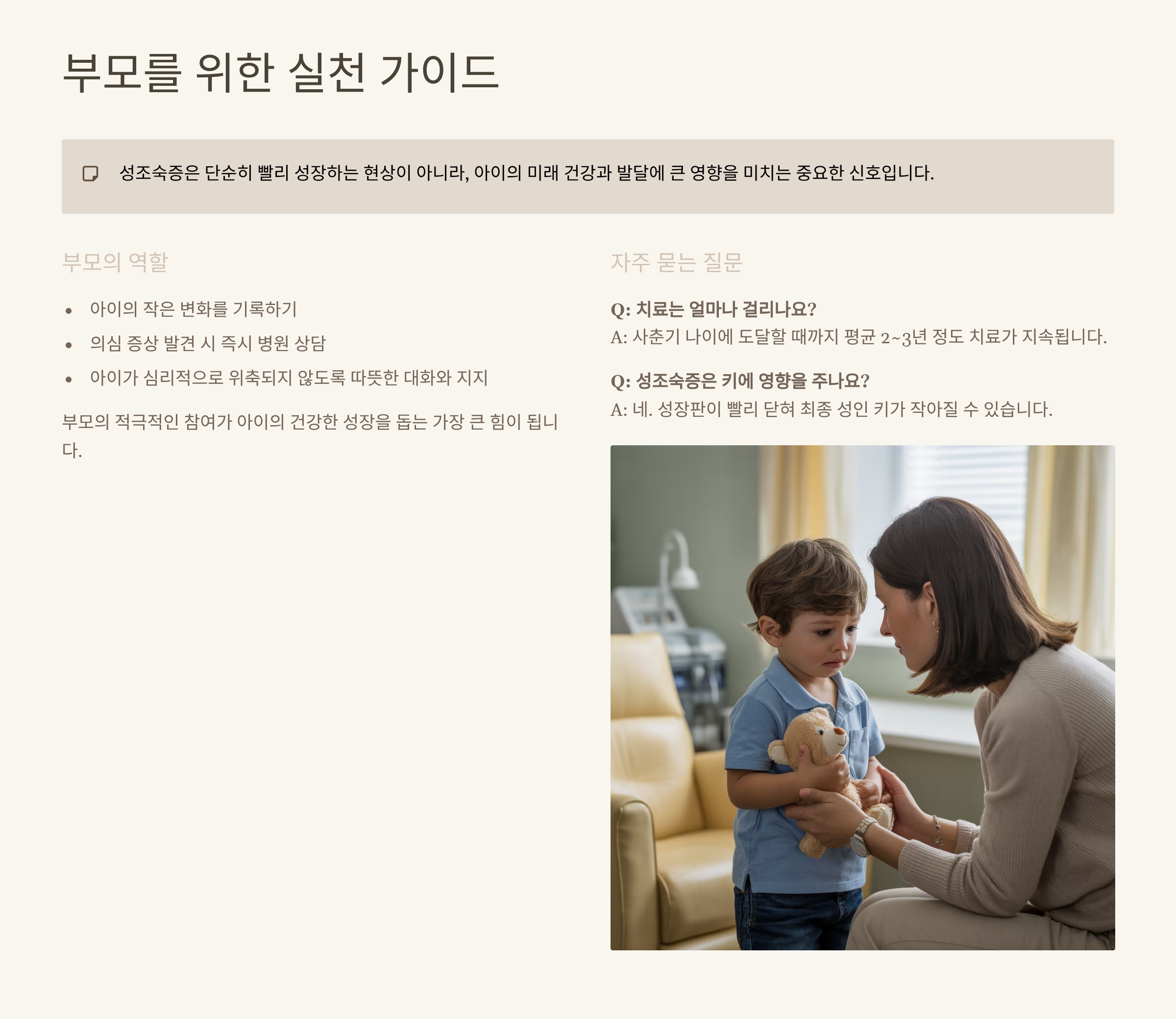 성조숙증은 단순히 빨리 성장하는 현상이 아니라, 아이의 미래 건강과 발달에 큰 영향을 미치는 중요한 신호입니다. 부모가 조기에 관심을 가지고 대응한다면, 아이는 더 건강하고 안정적으로 성장할 수 있습니다. 오늘 소개한 정보들이 여러분의 자녀 건강 관리에 도움이 되기를 바랍니다. 앞으로 아이와 함께하는 모든 날이 건강하고 행복하길 응원합니다.