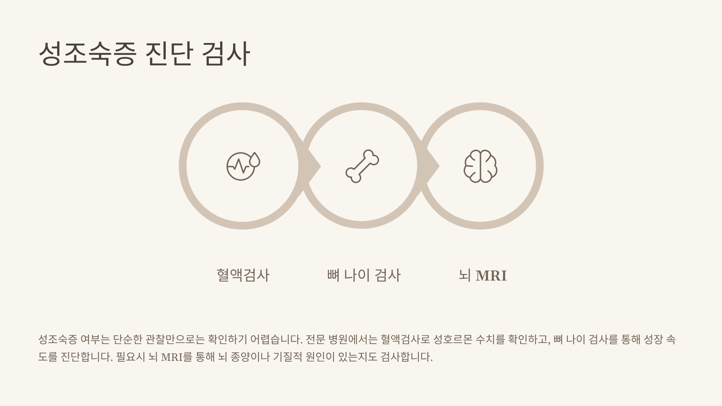 성조숙증 여부는 단순한 관찰만으로는 확인하기 어렵습니다. 전문 병원에서는 혈액검사로 성호르몬 수치를 확인하고, 뼈 나이 검사를 통해 성장 속도를 진단합니다. 필요시 뇌 MRI를 통해 뇌 종양이나 기질적 원인이 있는지도 검사합니다. 이러한 종합적인 검사 과정을 통해 조기 진단이 이루어집니다.
