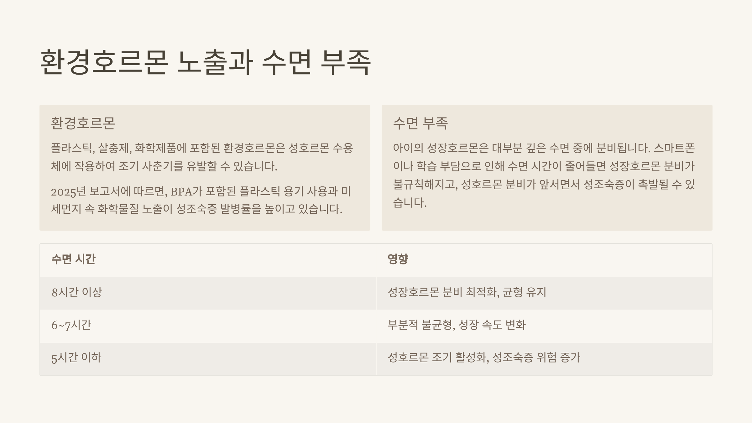| 5시간 이하 | 성호르몬 조기 활성화, 성조숙증 위험 증가 |