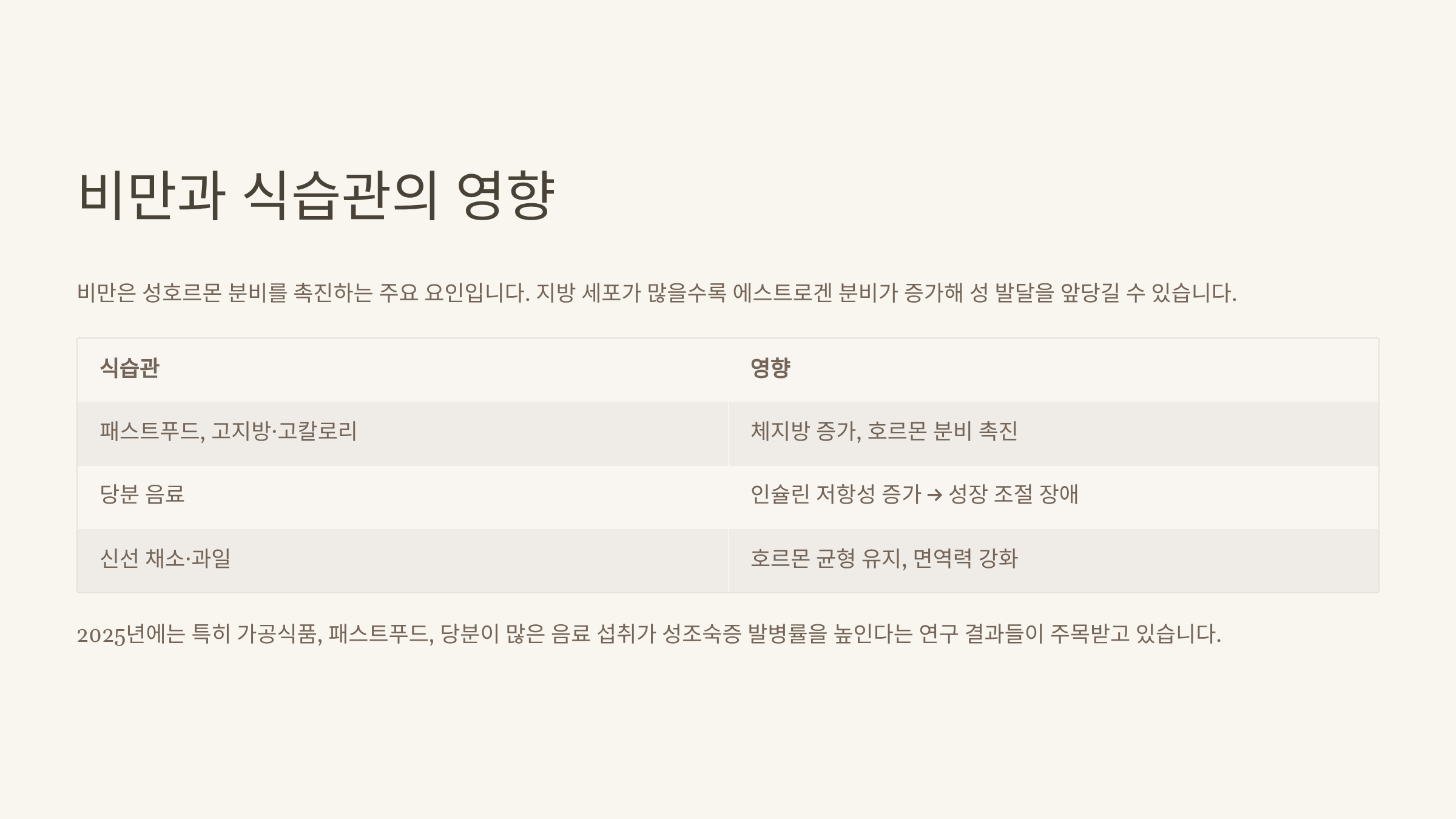| 패스트푸드 | 고지방·고칼로리 → 체지방 증가, 호르몬 분비 촉진 |
