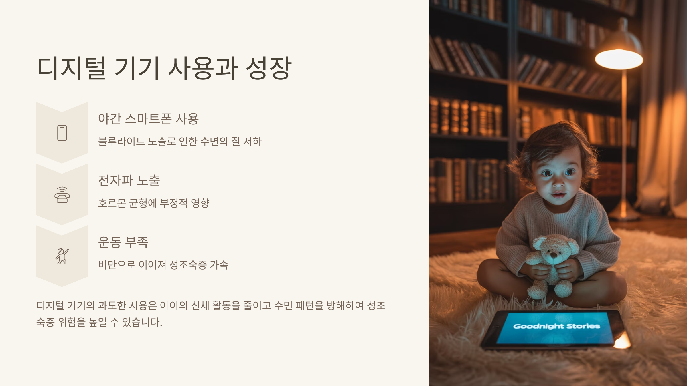 야간 사용은 수면을 방해하고 호르몬 균형을 무너뜨려 성조숙증 위험을 높일 수 있습니다.