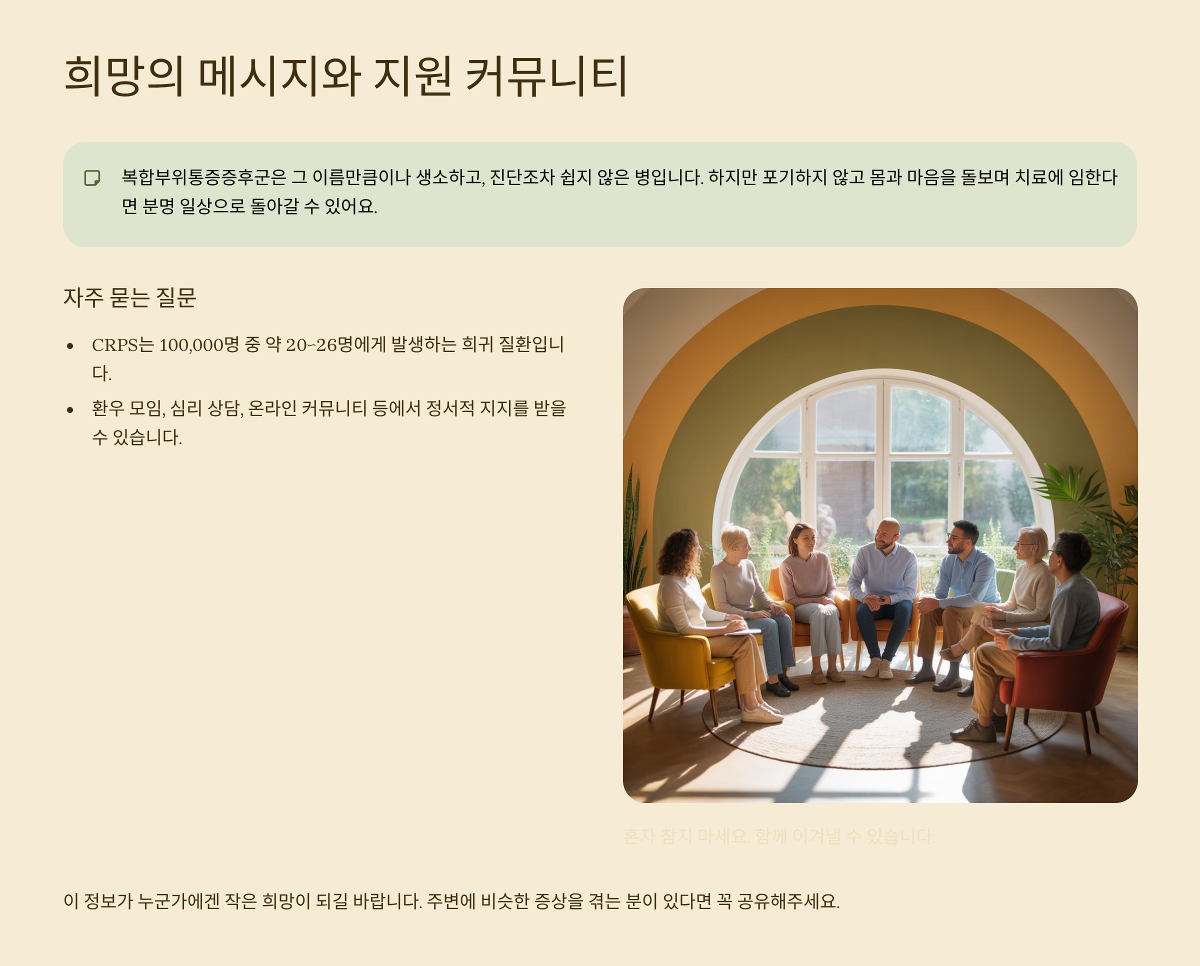 Q CRPS로 인해 정신적으로도 힘들어요. 도움 받을 곳이 있나요?환우 모임, 심리 상담, 온라인 커뮤니티 등에서 정서적 지지를 받을 수 있습니다. 혼자 참지 마세요.
