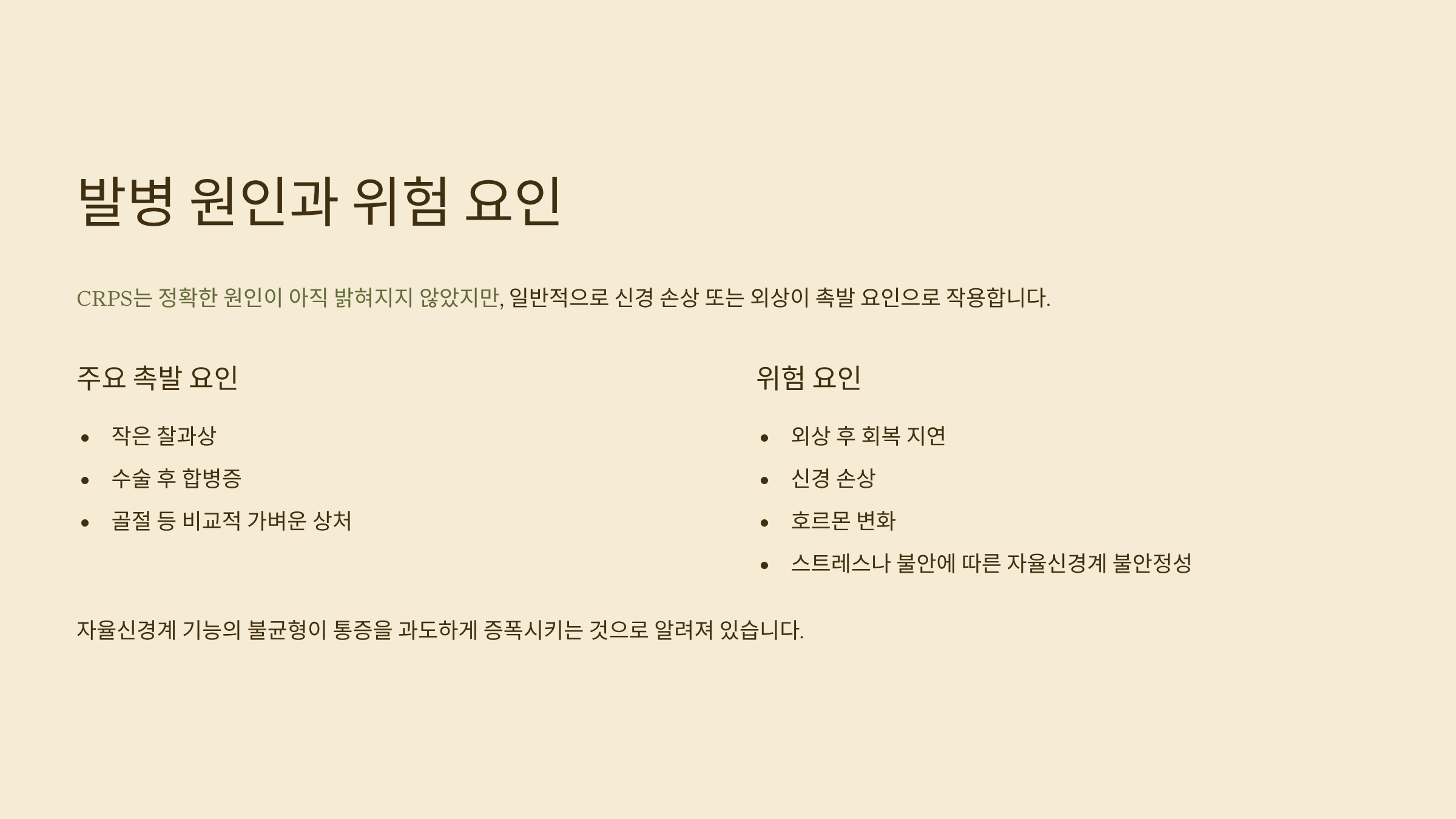 CRPS는 정확한 원인이 아직 밝혀지지 않았지만, 일반적으로 신경 손상 또는 외상이 촉발 요인으로 작용해요. 작은 찰과상, 수술, 골절 등 비교적 가벼운 상처 이후 발생할 수 있으며, 자율신경계 기능의 불균형이 통증을 과도하게 증폭시키는 것으로 알려져 있어요.