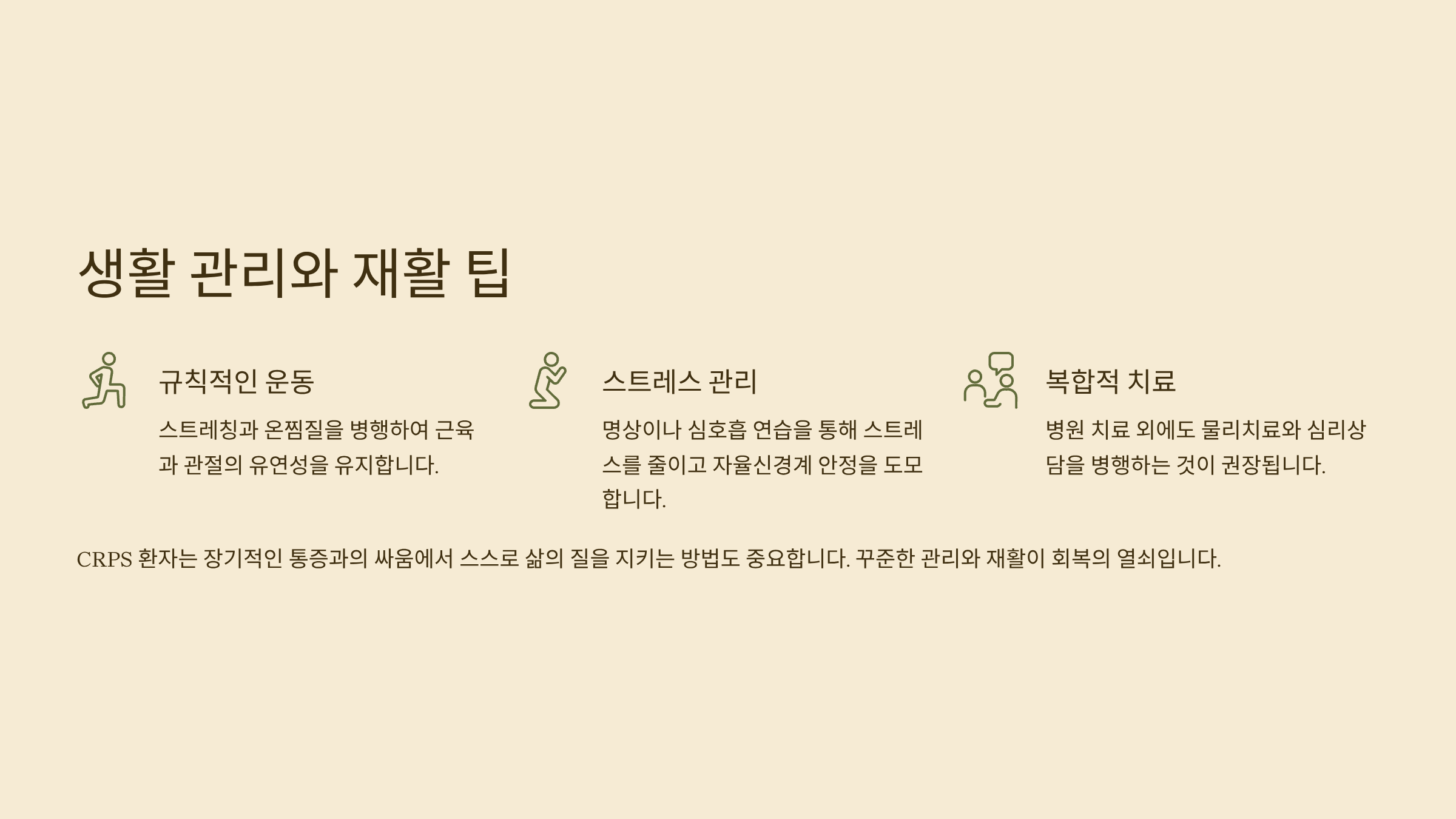 CRPS 환자는 장기적인 통증과의 싸움에서 스스로 삶의 질을 지키는 방법도 중요해요. 다음은 효과적인 생활 팁입니다.