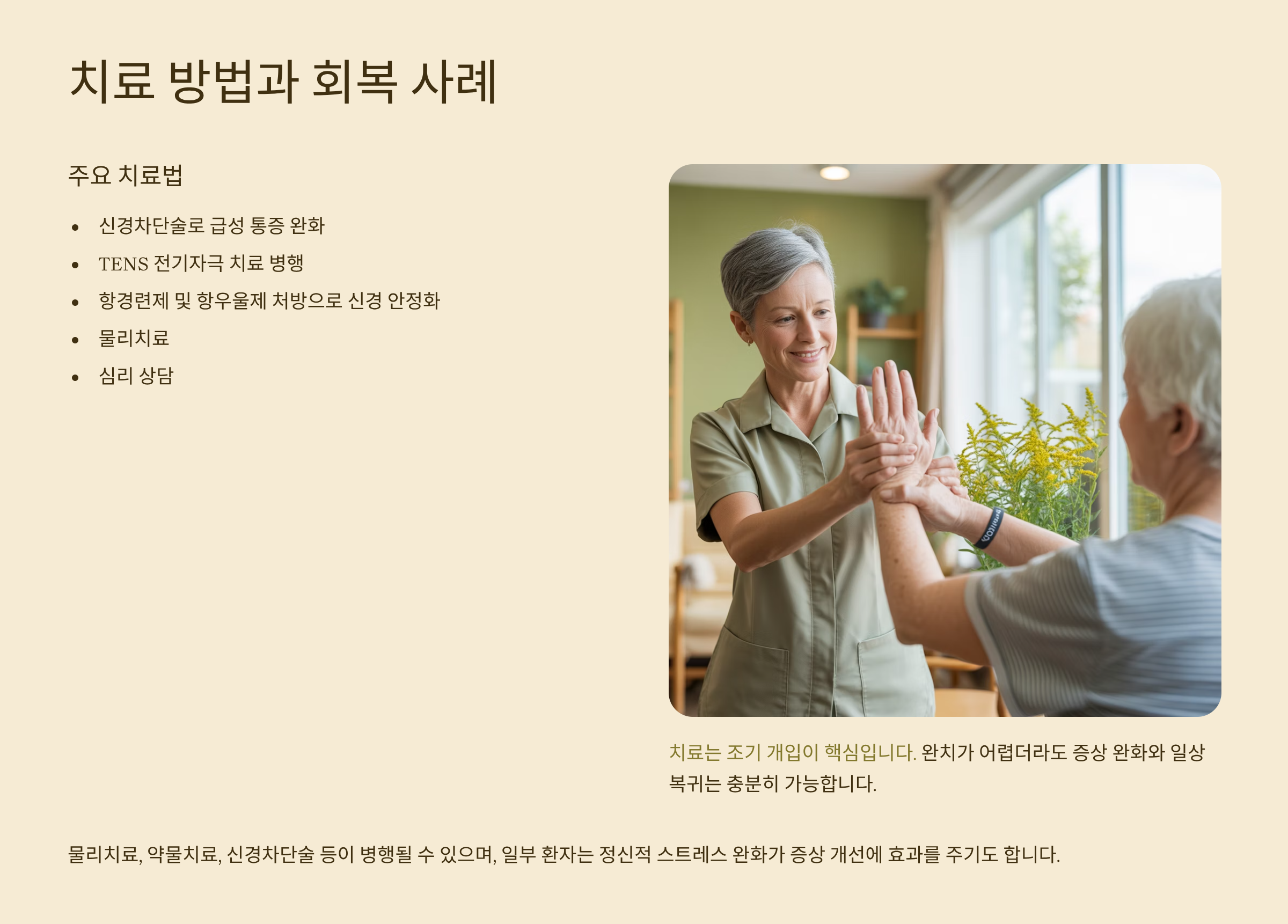 치료는 조기 개입이 핵심이에요. 물리치료, 약물치료, 신경차단술 등이 병행될 수 있으며, 일부 환자는 정신적 스트레스 완화가 증상 개선에 효과를 주기도 합니다.